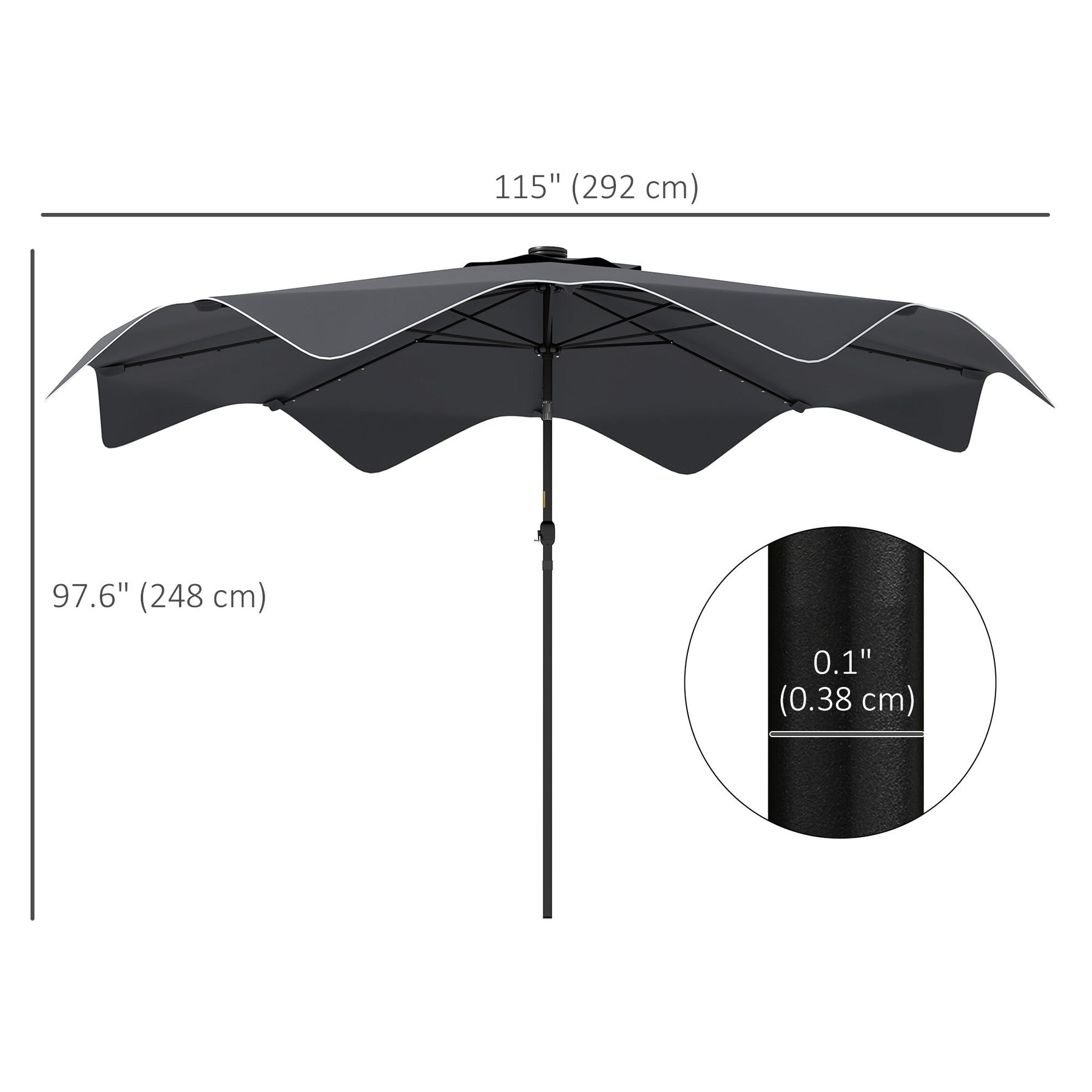 Sized Right: Overall Dimensions: Dia 9.6' x 8.1' H (Dia 2.92 x 2.48 m). Compatible with umbrella bases over 55 lbs. (25 kg). Recommended bases: 840-117, 84D-122. Not suitable for extreme weather.