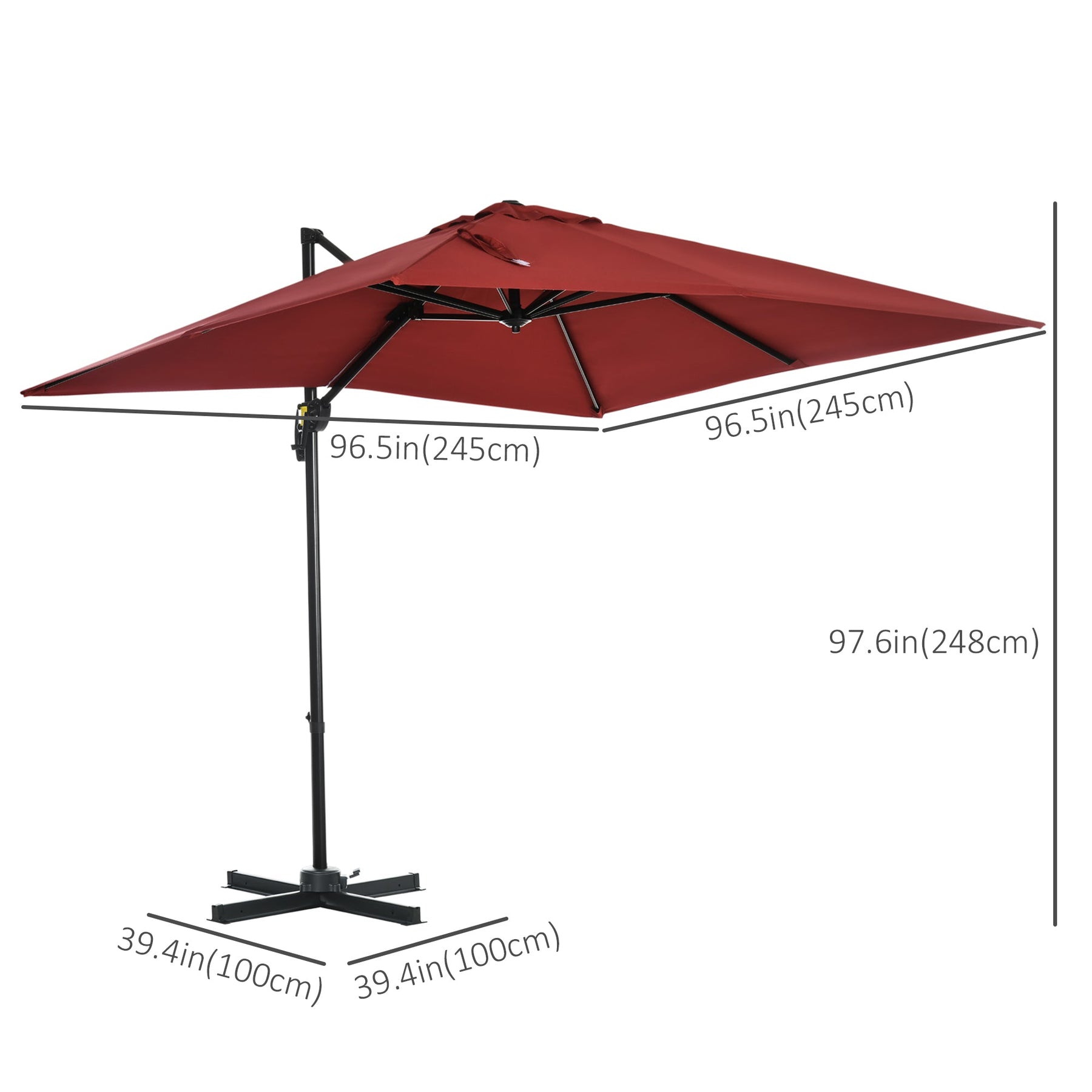 Outsunny Square Patio Hanging Offset Umbrella 8' x 8' Aluminum Cantilever Crank Market Parasol 360° Rotation Cross Base Wine Red