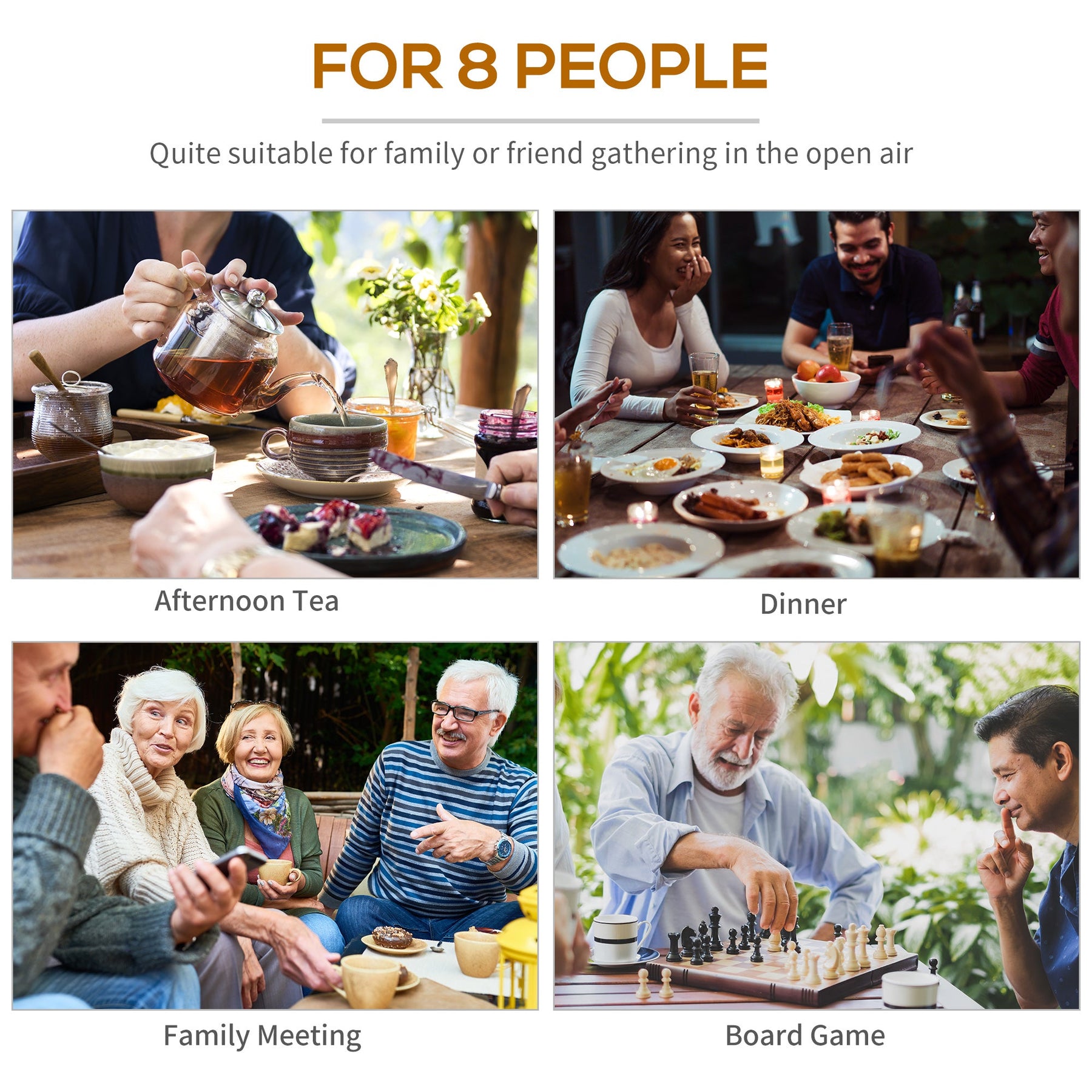 Host unforgettable outdoor meals with this 8-person patio dining set. Built for strength and style, this robust wood set includes a thick dining table and two matching benches, each with a 500 lbs. weight capacity. The smooth-finished edges ensure a safe and splinter-free experience, making it ideal for family use. Designed with versatility in mind, it’s perfect for patios, gardens, and even cafe-style settings. A central parasol hole offers added convenience for sunny days (parasol not included).