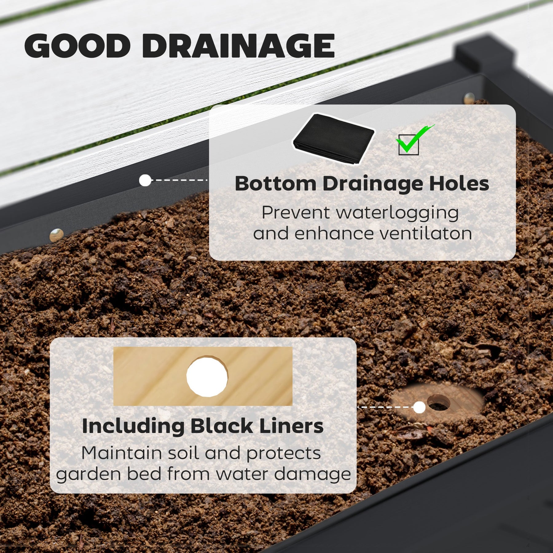 Enjoy the convenience of gardening without the strain. This dual-level raised garden bed features a spacious planter box on top and a handy lower shelf, giving you room to grow herbs, flowers, or veggies while keeping gardening tools or pots neatly stored below. Designed with two drainage holes and a black non-woven fabric liner, this planter ensures optimal water control and keeps soil neatly contained. Crafted from solid fir wood with a weather-resistant painted finish, it's built for outdoor durability and year-round use. Its elevated design also reduces bending and kneeling, making it perfect for gardeners of all ages.