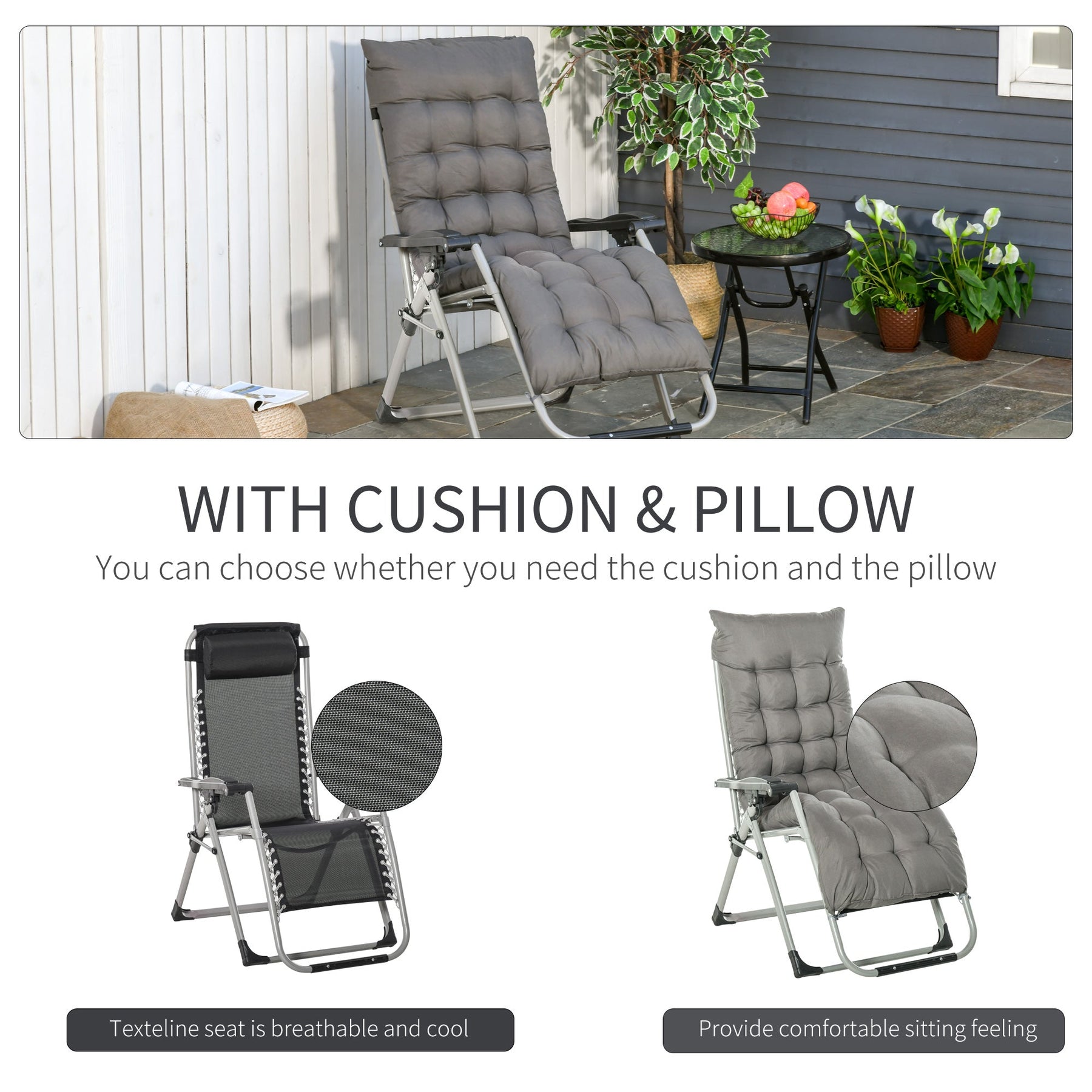 Experience total comfort with this reclining outdoor lounge chair, designed with smooth, stepless adjustment to match your preferred lounging angle. The ergonomic curves naturally fit the shape of your body, while the removable cushion and pillow let you tailor the experience to your liking. Its compact folding design makes it easy to store or carry to events, trips, or the backyard. Built with a sturdy metal frame and durable Texteline fabric, this lounger is made to last through many seasons of outdoor use.