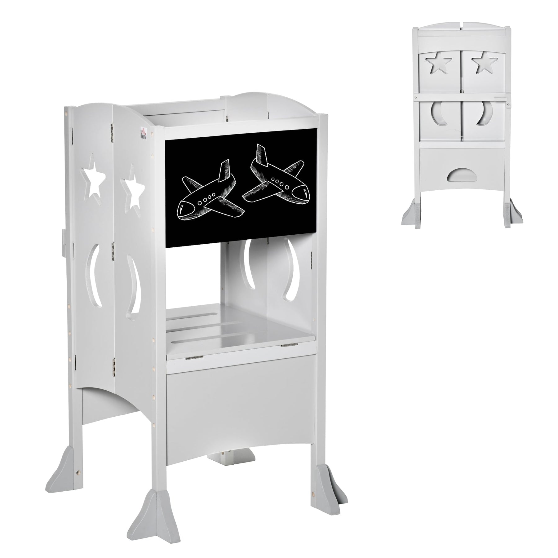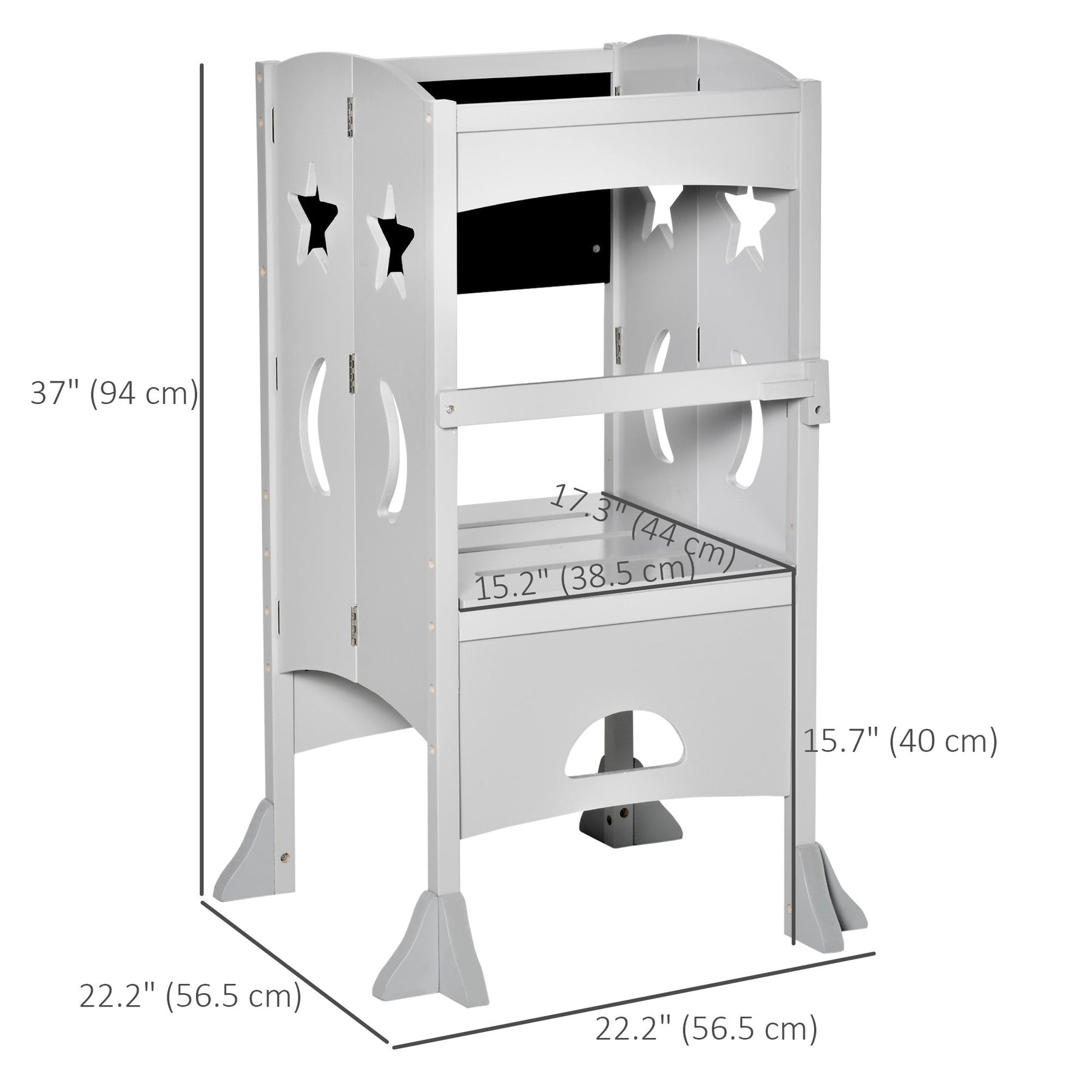 This kids' kitchen step stool is the perfect tool for encouraging independence while ensuring your child maintains proper posture. Ideal for a variety of settings such as the kitchen, washroom, and dining room, this toddler standing tower promotes the development of good habits by allowing children to engage in everyday activities. Featuring a chalkboard attached to the back, it enhances creativity and provides an extra outlet for fun and learning. The stool is designed with convenience in mind, offering a folding structure that allows for easy storage when not in use. Simply remove the pedal screw and chalkboard to stow it away in a corner. To ensure your child’s safety, the toddler helper stool features a 4-sided safety railing for added stability and a two-way lock structure to prevent accidental slips. Additionally, the reinforced foot brace helps prevent side tilt, providing a more secure and stable experience. Measuring 22.2" L x 22.2" W x 37" H, this sturdy stool is suitable for children aged 3-6 years and can support up to 110 lbs.