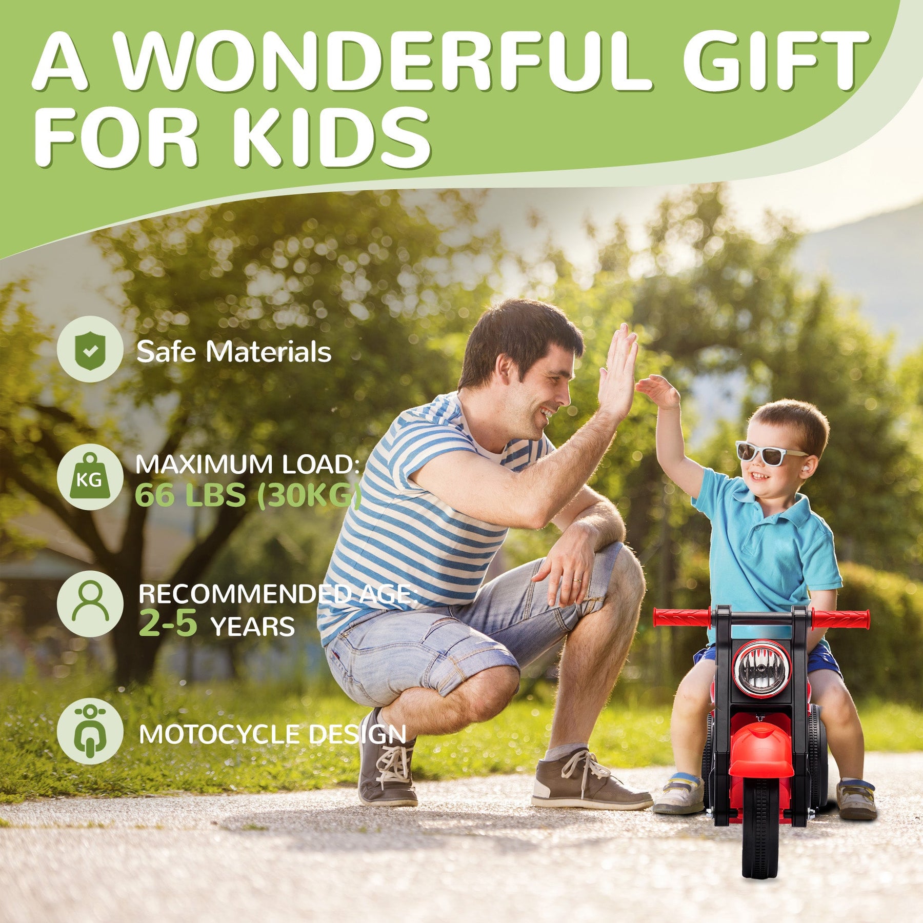 Introduce your toddler to the joy of play with this musical ride-on car, designed to bubble and play music, creating a fun and engaging sensory experience. Perfect for young children, this foot-to-floor design encourages walking and balance development as they push along. Crafted with durable plastic and metal, the cute motorcycle-inspired design ensures lasting enjoyment for years. Tailored for children aged 2-5 years, this ride-on car features easy-to-hold handles, making it the ideal size for little riders. It offers a wonderful combination of entertainment and physical development, all while keeping safety in mind.