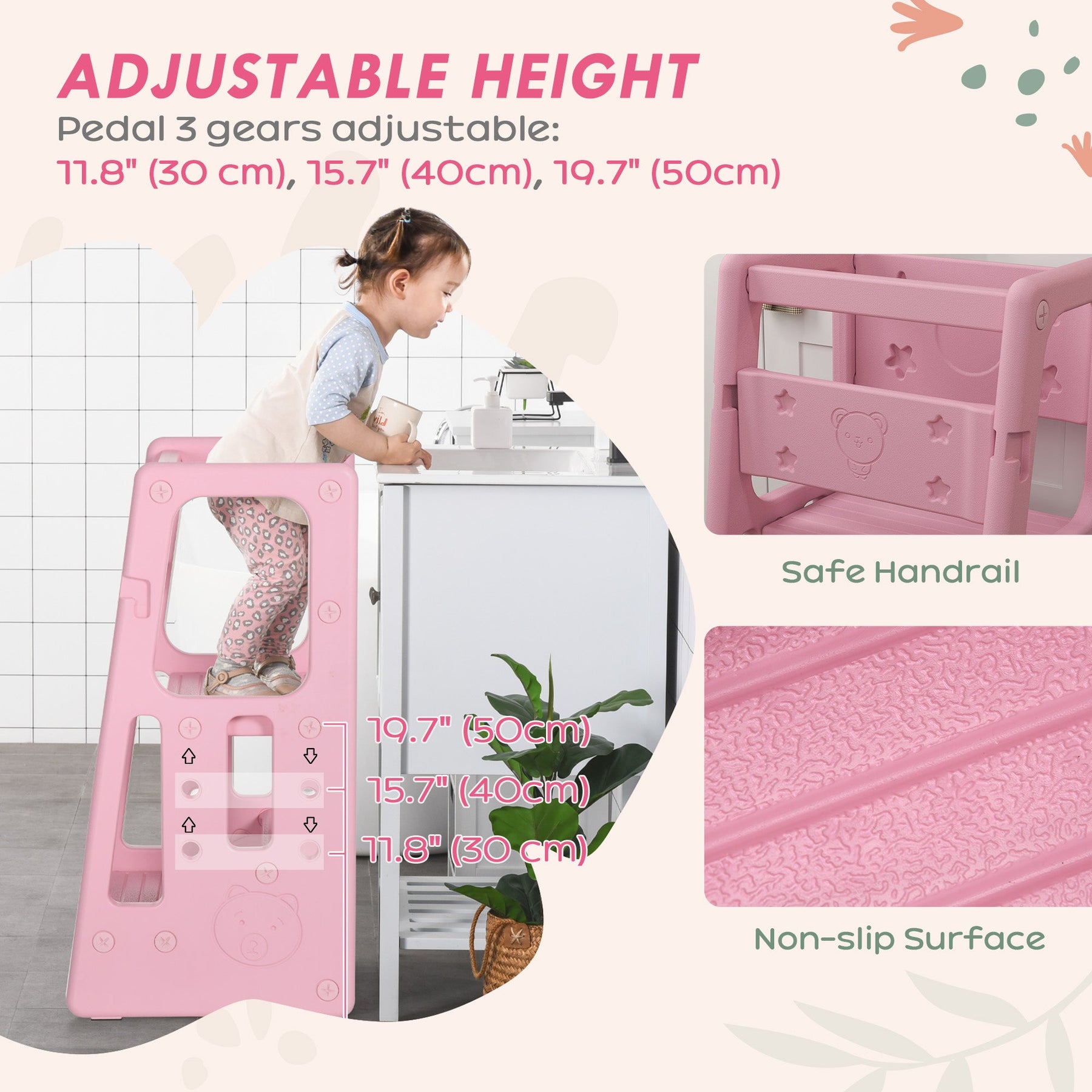 Encourage your child's independence and confidence with this thoughtfully designed toddler kitchen stool helper. Featuring an adjustable platform with three removable height levels, this step stool grows with your child and easily adapts to different tasks and ages. Whether it’s brushing teeth in the bathroom, helping out in the kitchen, or reaching the table in the dining room, this toddler standing tower supports safe, hands-on learning in a variety of settings. Constructed from durable, non-toxic HDPE material with no unpleasant odors, it ensures a safe environment for your little one. The trapezoid structure provides excellent stability, while the non-slip mat prevents slipping and tipping for added safety. Perfect for both indoor and outdoor use, this multifunctional toddler helper stool is a reliable companion in any room. With overall dimensions of 18.5" L x 18.5" W x 35.4" H and a weight capacity of 143 lbs, it is sturdy, easy to clean, and requires assembly. Note: Adult supervision is recommended during use.