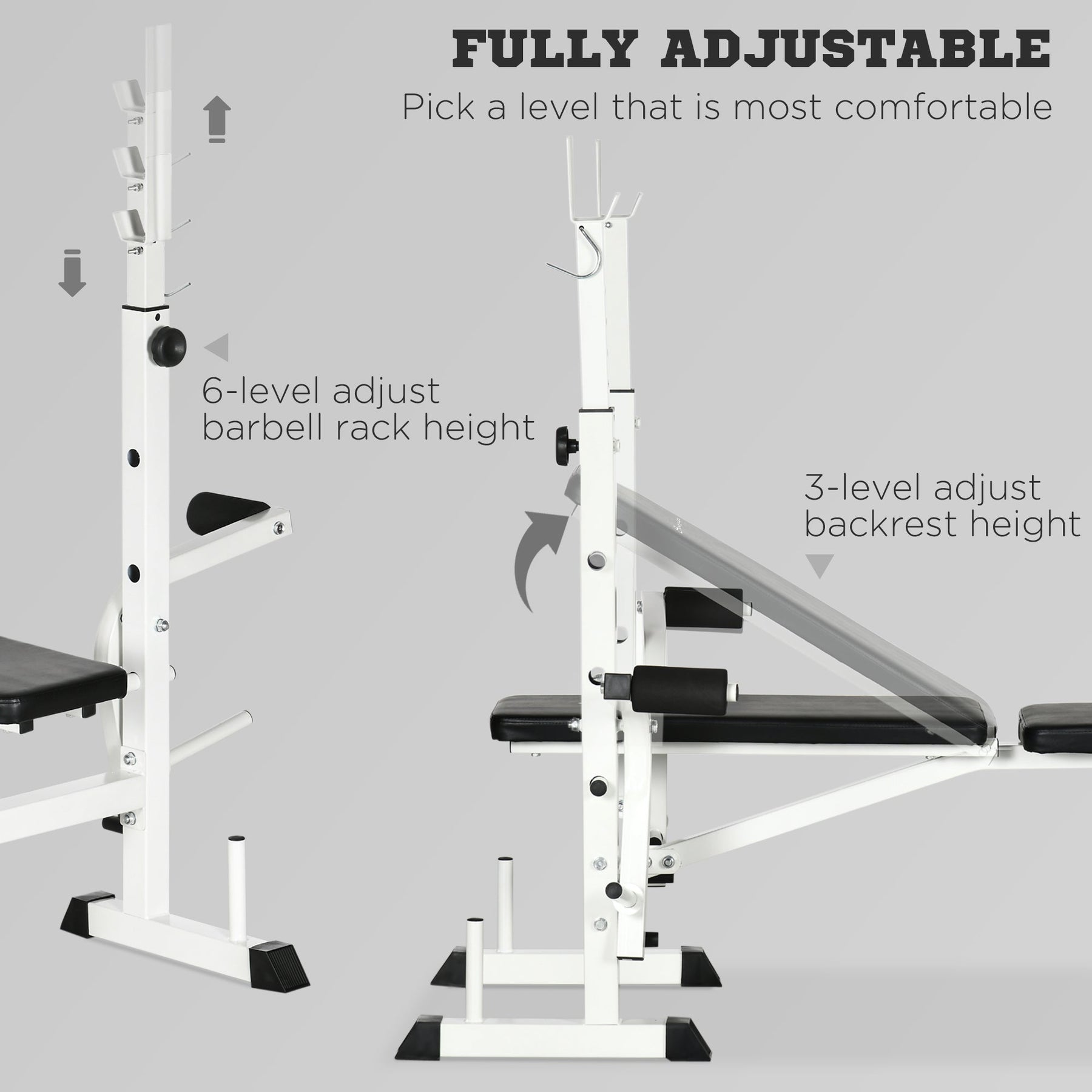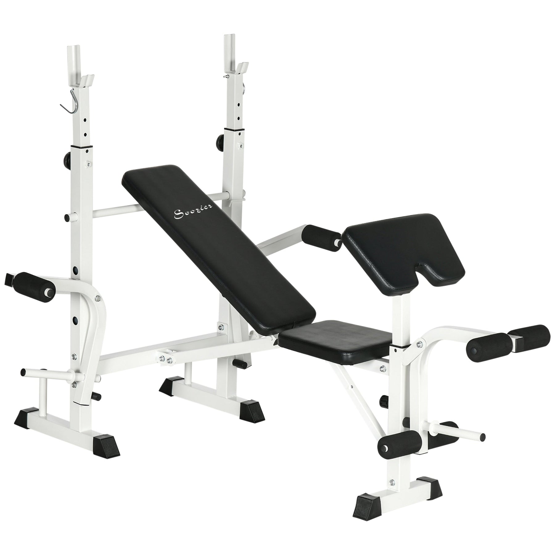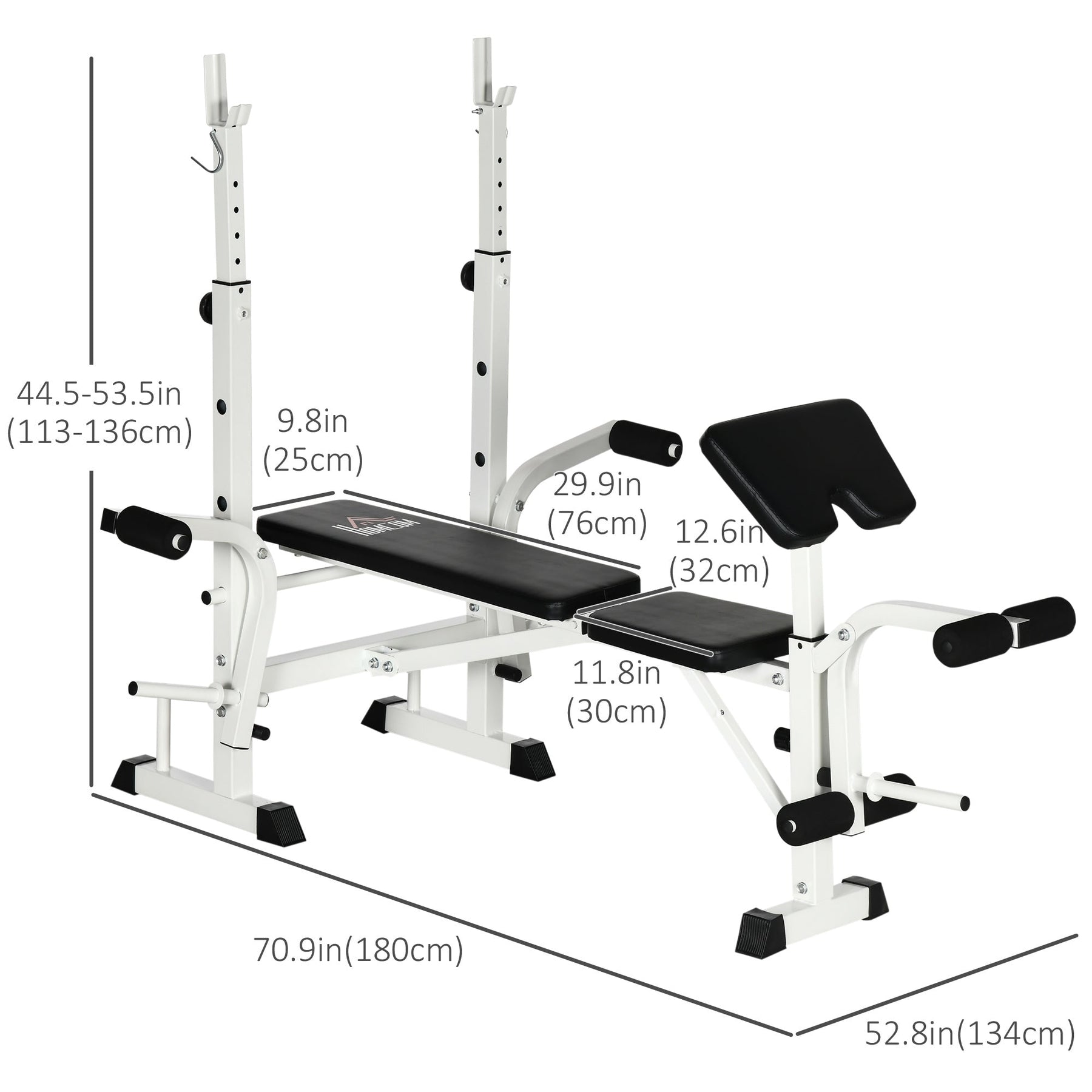 Multipurpose Workout Bench: Includes leg developer, preacher curl pad, chest fly, Olympic barbell rack, and plate rack—ideal for full-body strength training.