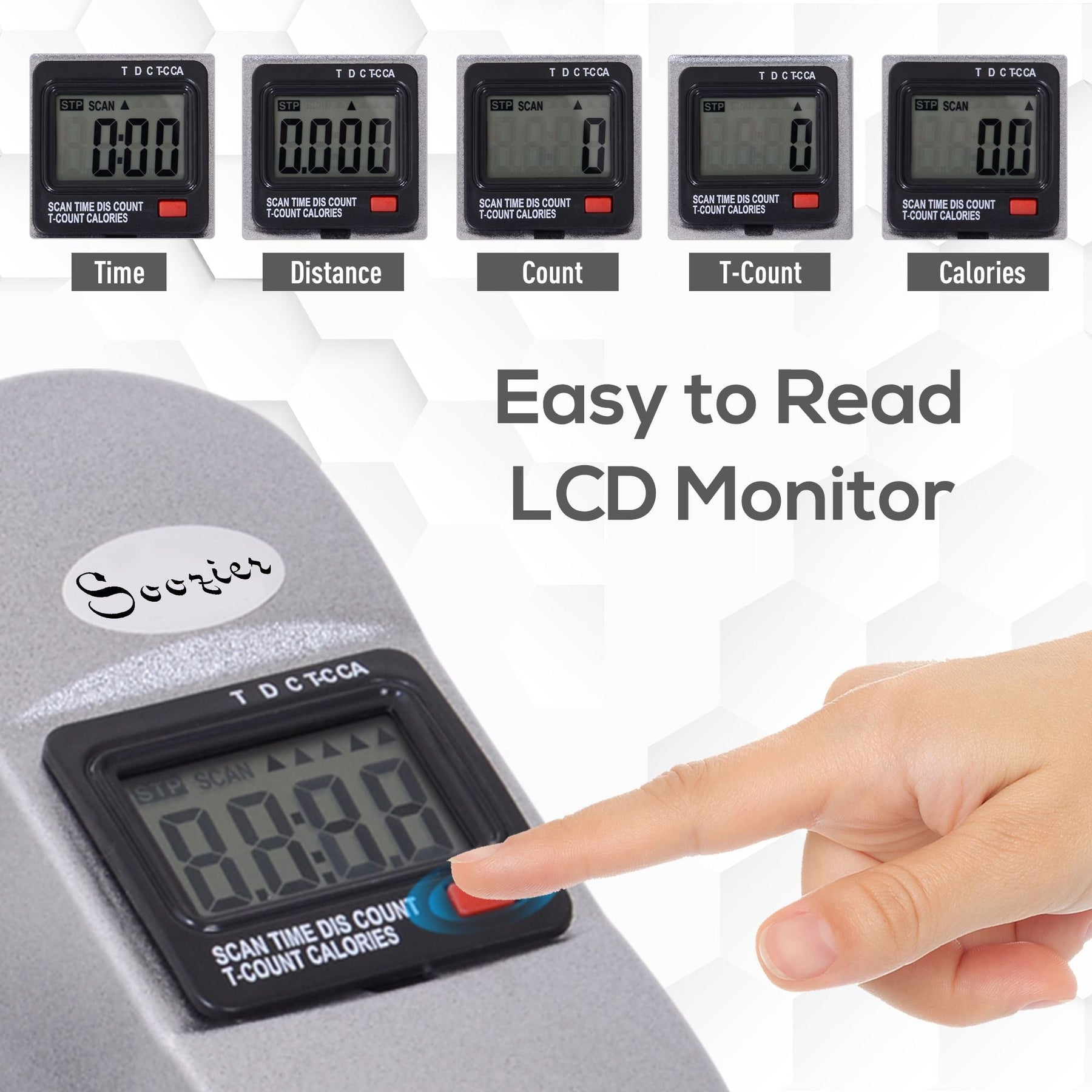 LCD Monitor: Large, easy-to-read screen displays time, speed, count, and total calories burned with a simple touch.