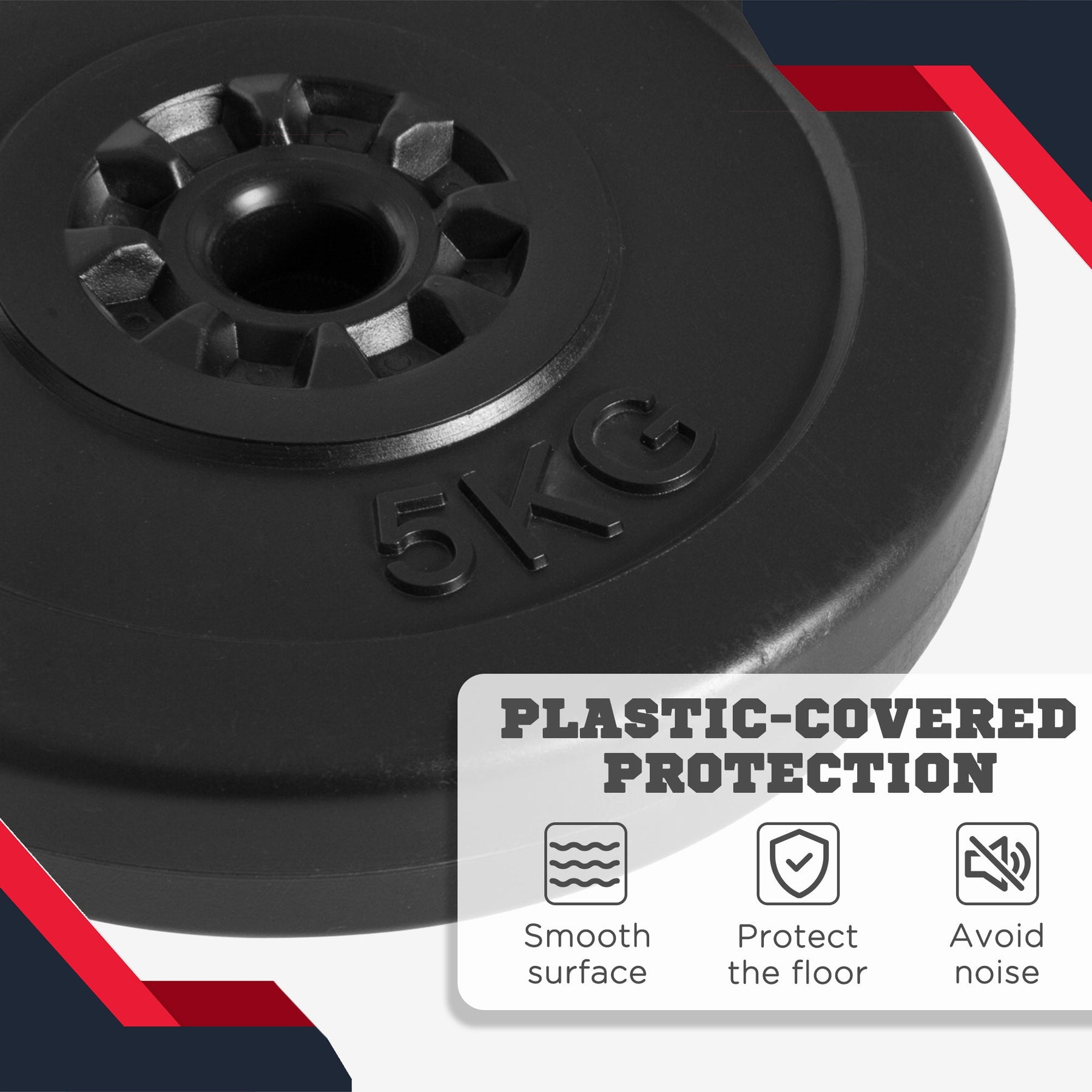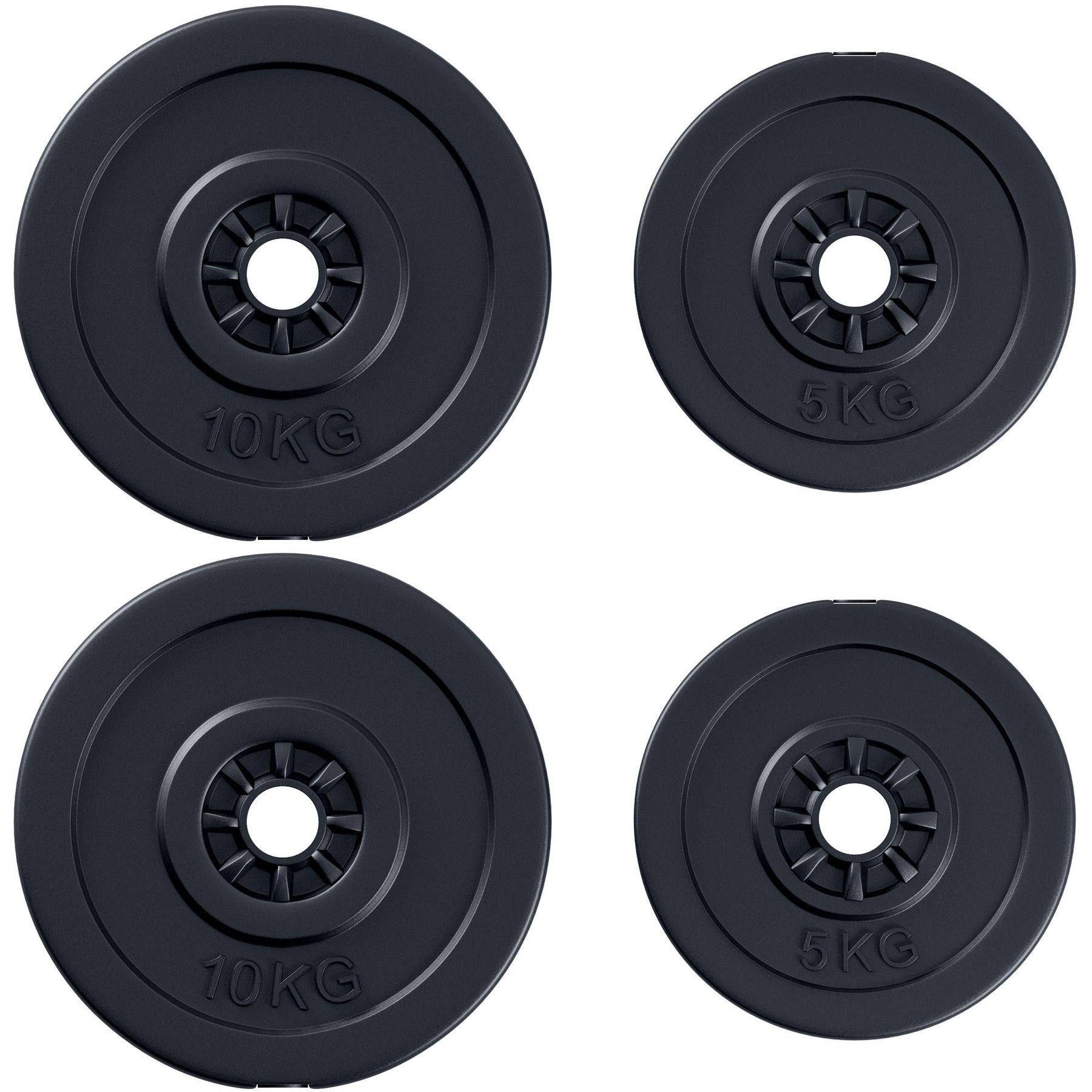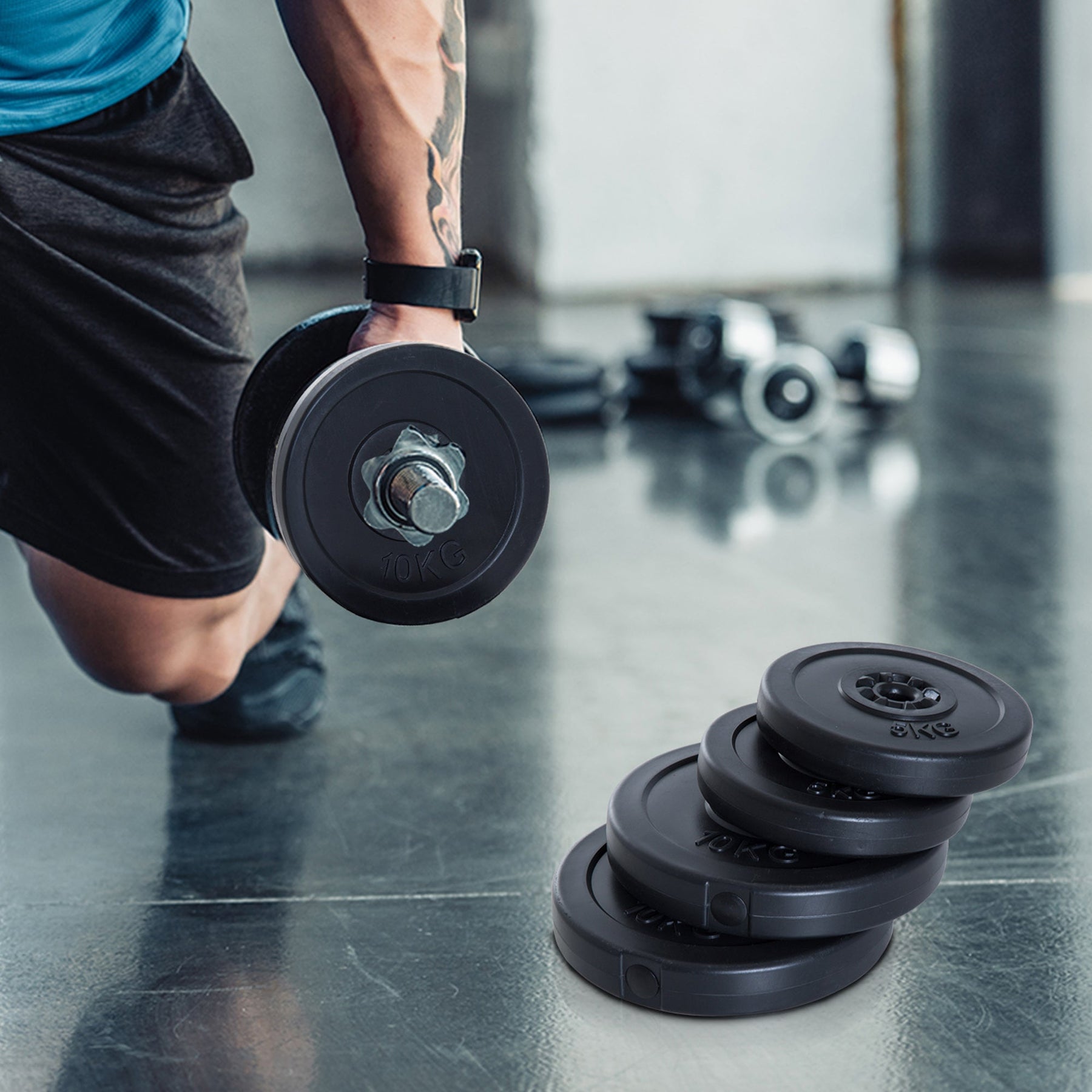 This 4-piece weight plate set is designed to enhance your strength training routine, offering a variety of weight classes to target the main muscle groups. Made of plastic-coated cement, these weights provide silent, safe workouts while protecting your floor from damage. The versatile set can be used for both dumbbell and barbell exercises, helping you build power in your body, legs, hips, and back. The clear weight markings on each plate ensure easy identification, making it simple to adjust the intensity of your workout. Ideal for home gyms, the set includes two 11 lbs plates and two 22 lbs plates, giving you a total weight of 66 lbs (30 kg) to help you achieve your fitness goals.