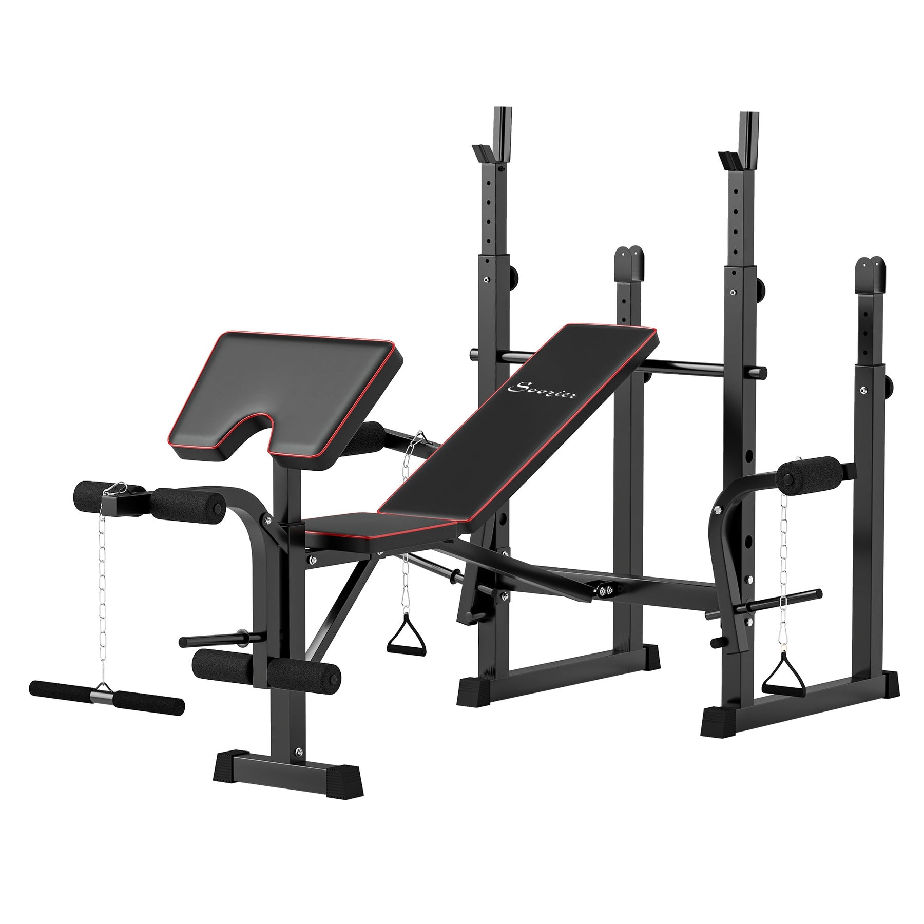 Take your home workouts to the next level with this all-in-one gym station. Combining a bench press rack, preacher curl bench, low row bar, chest fly, and leg curl machine, this weight bench is perfect for a versatile, full-body workout. The adjustable squat rack features two walk-in barbell racks with 5 height levels, supporting up to 661lbs (300kg), making it ideal for various weightlifting exercises. With multi-position adjustments, including a four-angle workout bench and a four-height preacher curl pad, this setup allows you to customize your training angles, ranging from 29.8" to 34.6" (75.8–87.8cm). Tailor your strength training with three weight posts, providing flexibility in your workout routine. Built with durable 50mm x 50mm thick square steel tubes for stability, and complemented by thick padded cushions and foam rollers for comfort, this weight bench ensures a robust and comfortable workout experience.