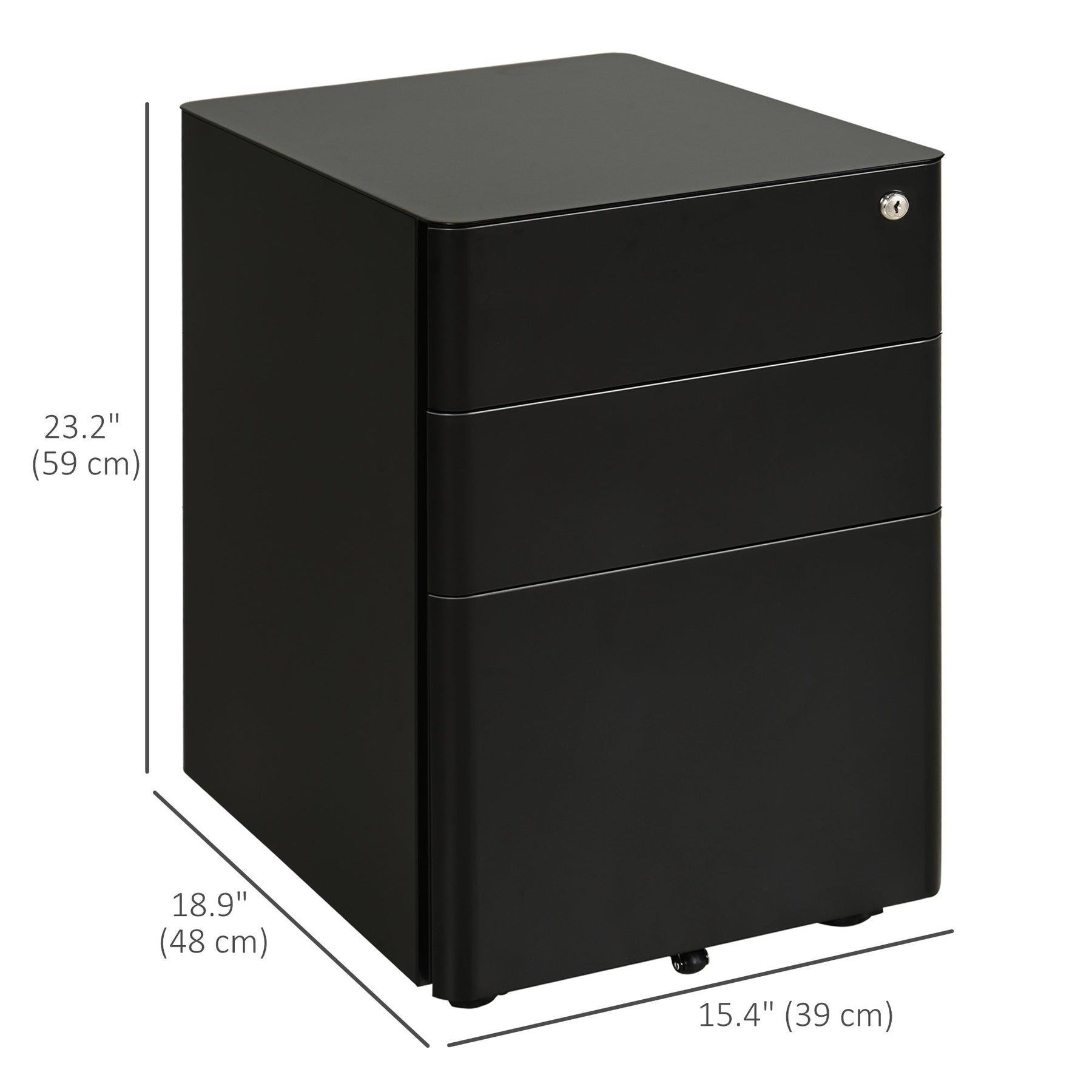 Maximize your workspace without compromising on storage with this compact yet spacious under-desk filing cabinet. Designed to fit in tight spaces (15.4" W x 18.9" D x 23.2" H / 39 x 48 x 59 cm), it provides generous storage with three drawers, including a divided pencil tray and a top area perfect for your printer. Keep your important documents organized with ease thanks to the large drawer’s adjustable hanging rail, which accommodates A4, legal, and letter-sized files—making it simple to find what you need when you need it. The office storage cabinet features a top lock that secures all drawers, offering added security for your sensitive files, with two keys included. For enhanced safety, the rounded corner design minimizes the risk of accidental bumps. Mobility is a breeze with four 360° swivel casters, and an additional auxiliary caster ensures extra stability and prevents tipping when moving. Crafted from durable powder-coated steel, this cabinet is resistant to corrosion and rust, supporting up to 110 lbs. (50 kg). Assembly is quick and easy—simply attach the five wheels for a smooth setup.