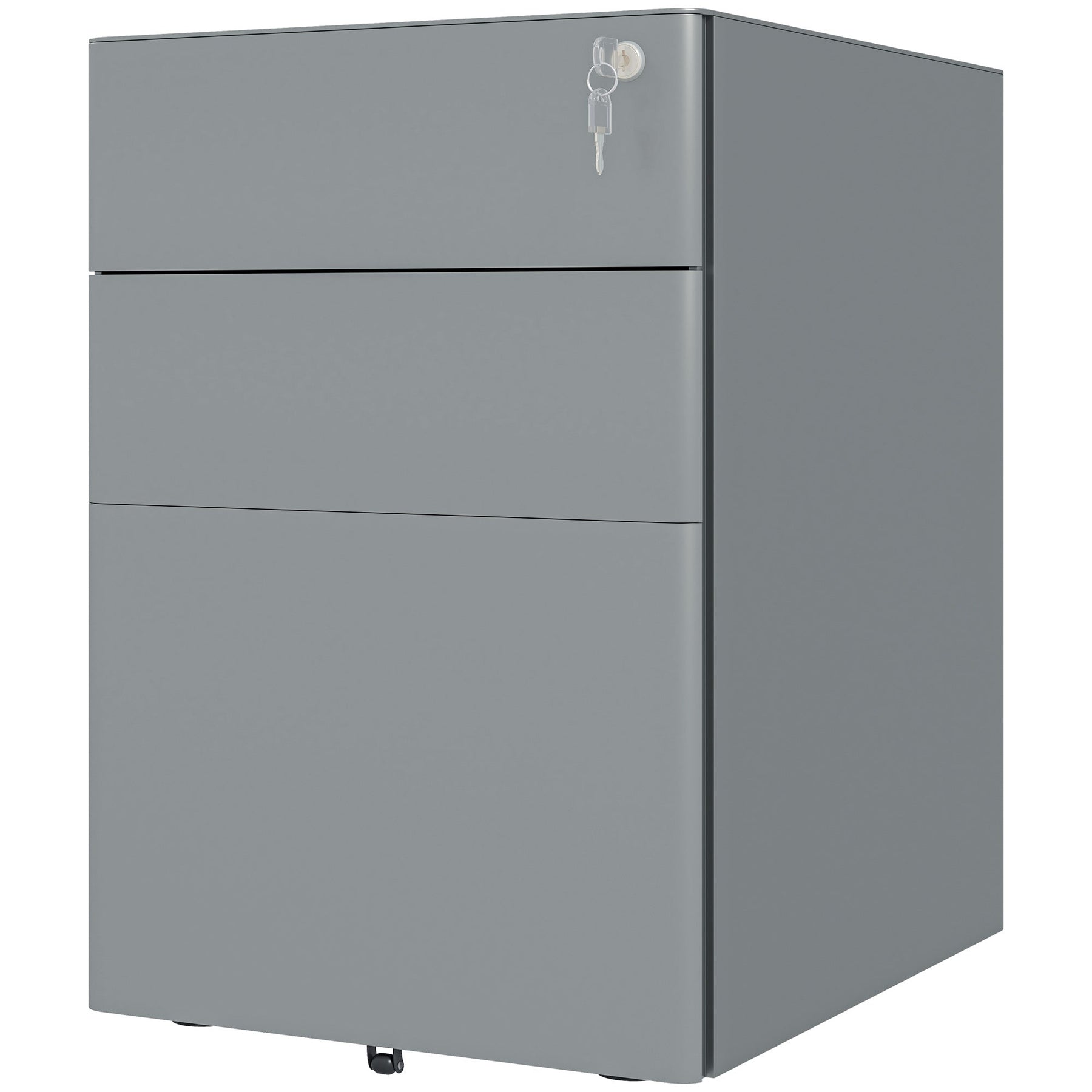 Optimize your workspace with this compact yet spacious under-desk filing cabinet, designed to fit snugly into tight spaces without sacrificing storage capacity. Measuring just 15.4" W x 18.9" D x 23.2" H (39 x 48 x 59 cm), it offers three roomy drawers, including a divided pencil tray for small supplies and a spacious top ideal for placing your printer or office essentials. The bottom drawer features an adjustable hanging rail, allowing you to neatly organize A4, legal, and letter-sized files so you can keep documents within easy reach and in order. A single top lock secures all drawers simultaneously, providing peace of mind with two included keys. The rounded corner design adds a layer of safety by preventing accidental bumps in compact workspaces. Designed for both mobility and stability, this cabinet moves effortlessly on four 360° swivel casters, while an auxiliary caster prevents tipping and adds support. Crafted from powder-coated steel, the cabinet is built to resist rust and corrosion, supporting up to 110 lbs. With its pre-assembled body and simple wheel installation, setup is quick and easy—perfect for busy professionals.