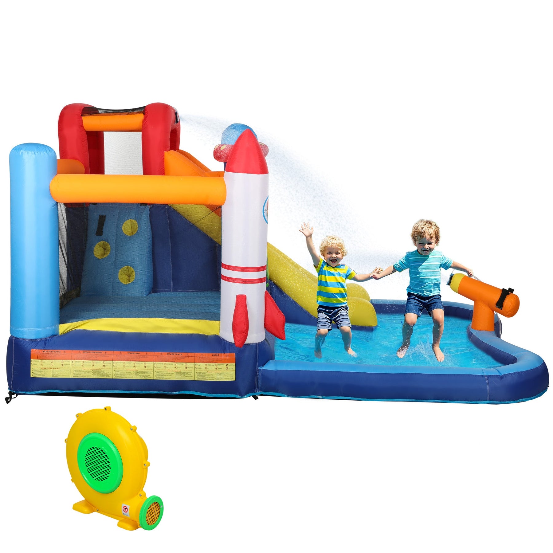 5-in-1 design includes splash pool, high slide, climbing wall, jumping area, and water cannon for endless fun