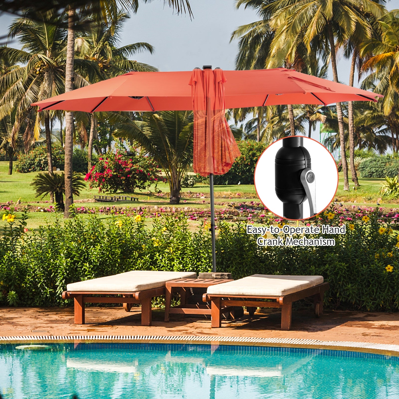 Extra-Large Double-Sided Canopy: Spanning 15 ft, the umbrella offers ample shade, making it ideal for patios, backyards, markets, or cafes.