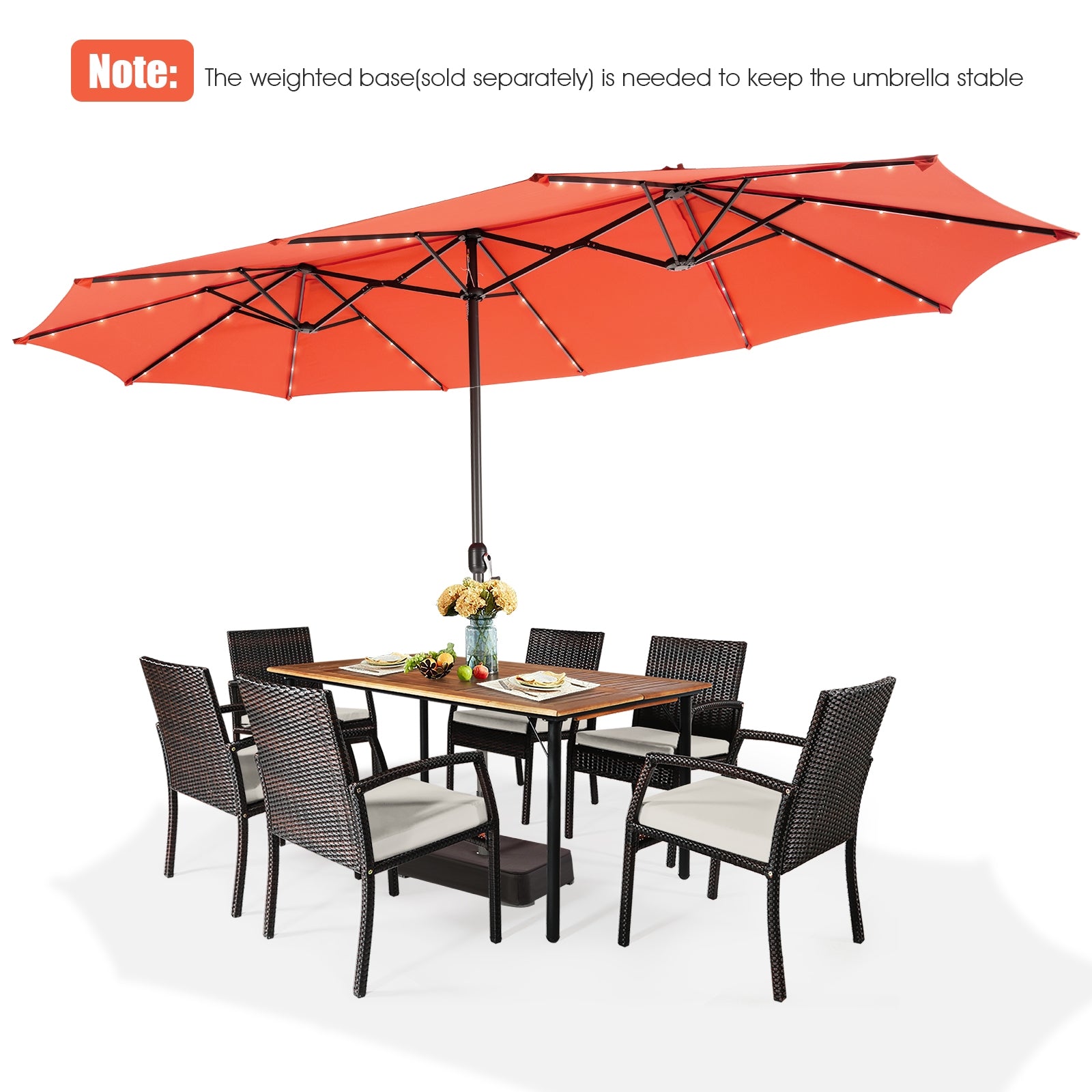 Elevate your outdoor experience with this stylish and functional double-sided patio umbrella. Designed to provide extra-large shade during the day and a warm glow at night, it is the perfect addition to any outdoor setting, whether for residential or commercial use.