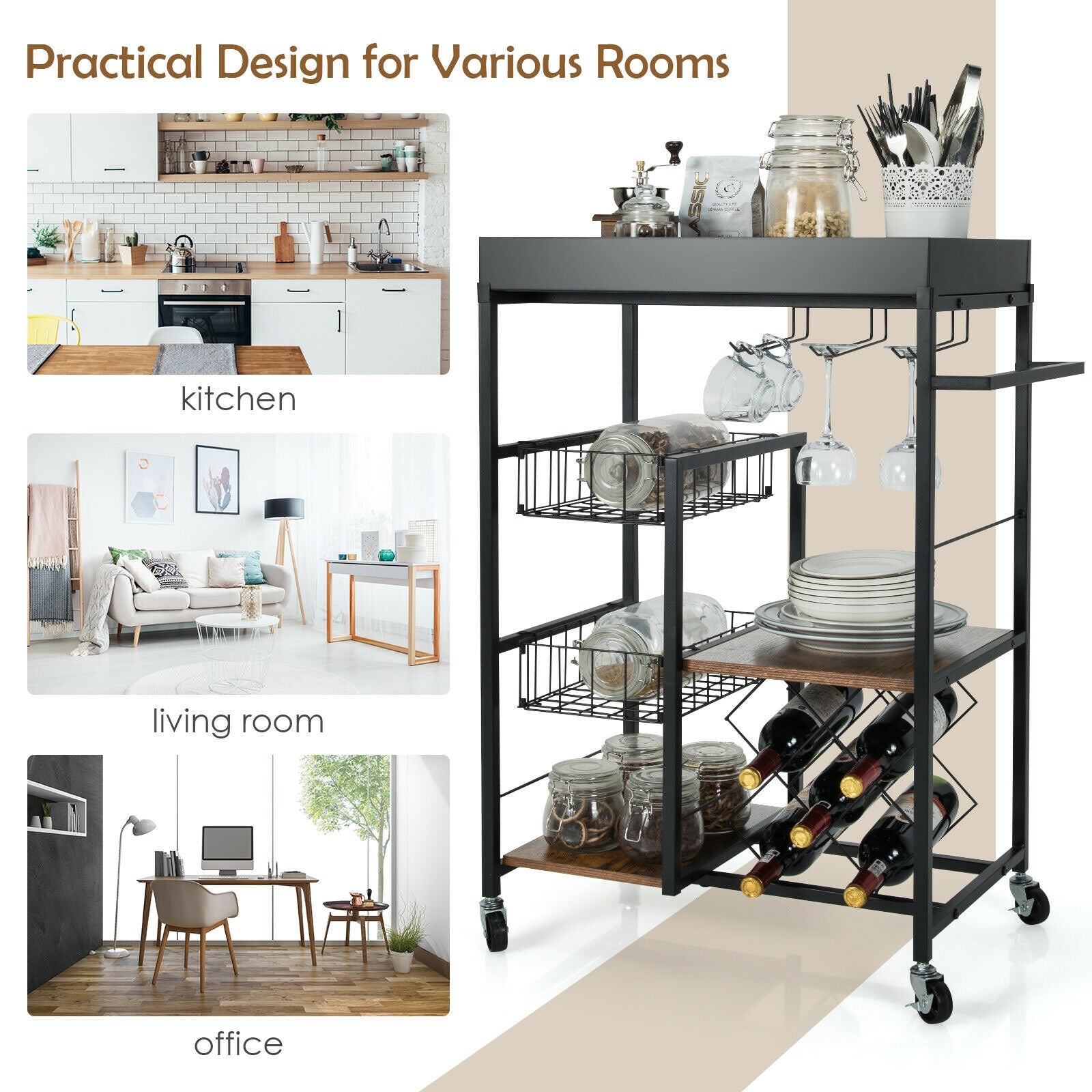 Ample Storage: With two open shelves, two mesh baskets, a 5-bottle wine rack, and a glass holder, this cart offers versatile storage for your bottles, glassware, and other essentials.