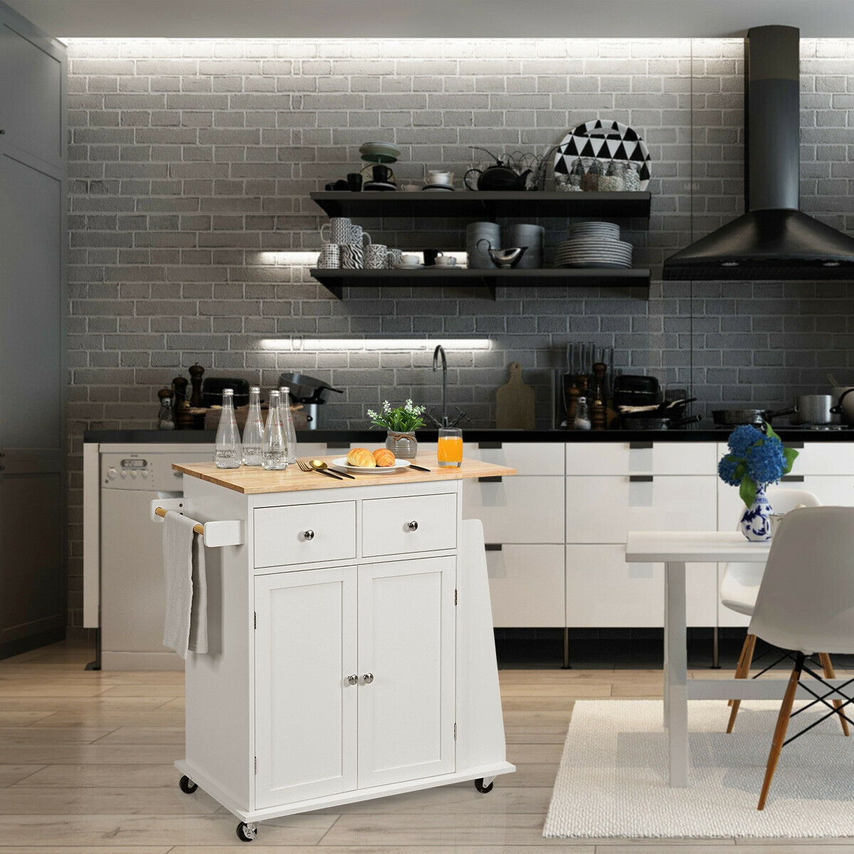 Elegant & Versatile Design: The natural wood-colored countertop and black/white cabinet create an elegant look that complements any home decor. This cart can be used as extra storage or counter space in your kitchen, living room, bedroom, or as a mobile preparation station.