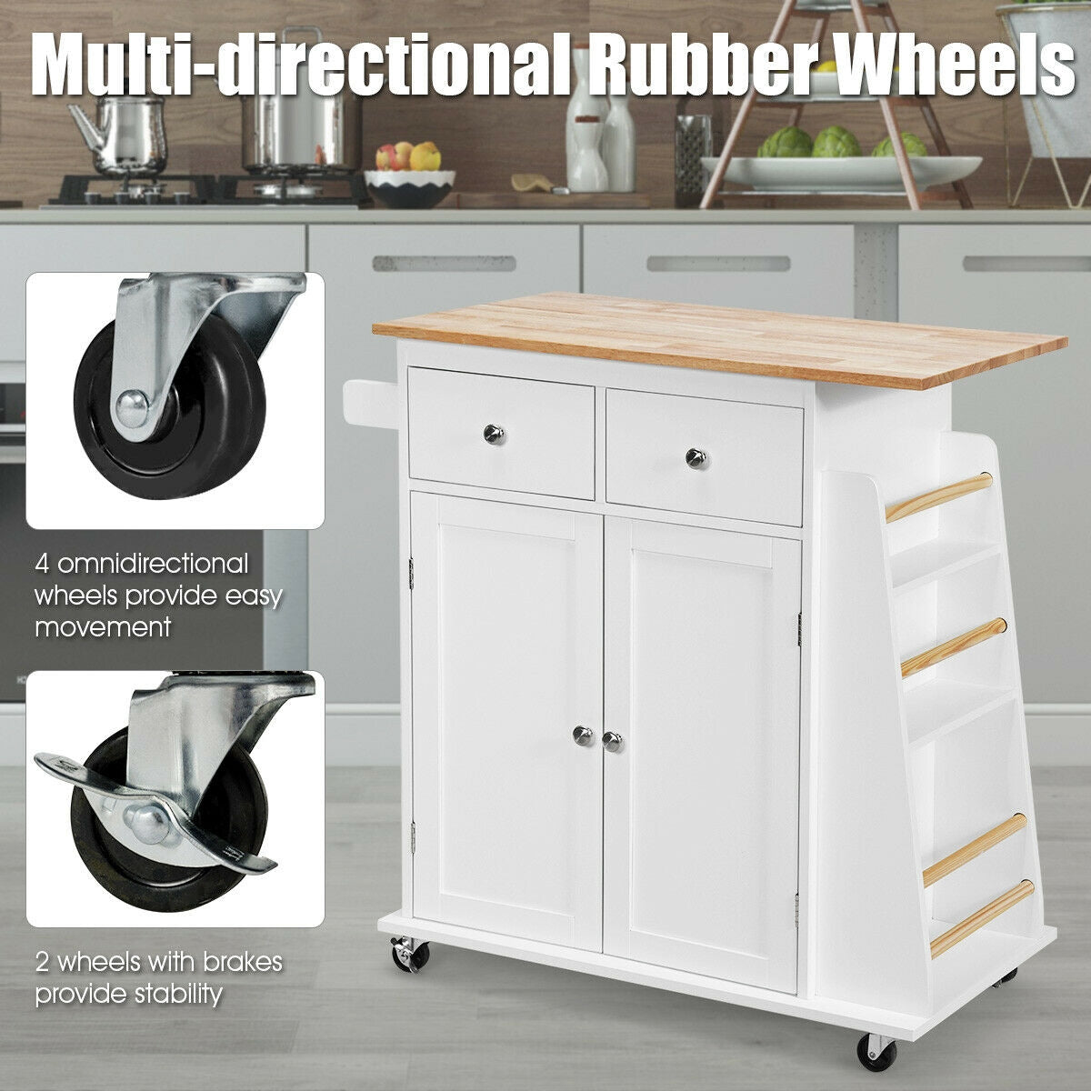 Multiple Storage Options: Equipped with 2 drawers, a 2-door cabinet, and a 3-tier spice rack, this kitchen cart offers plenty of storage space for organizing kitchen essentials. The towel rack on the side also serves as a convenient handle for easy movement.