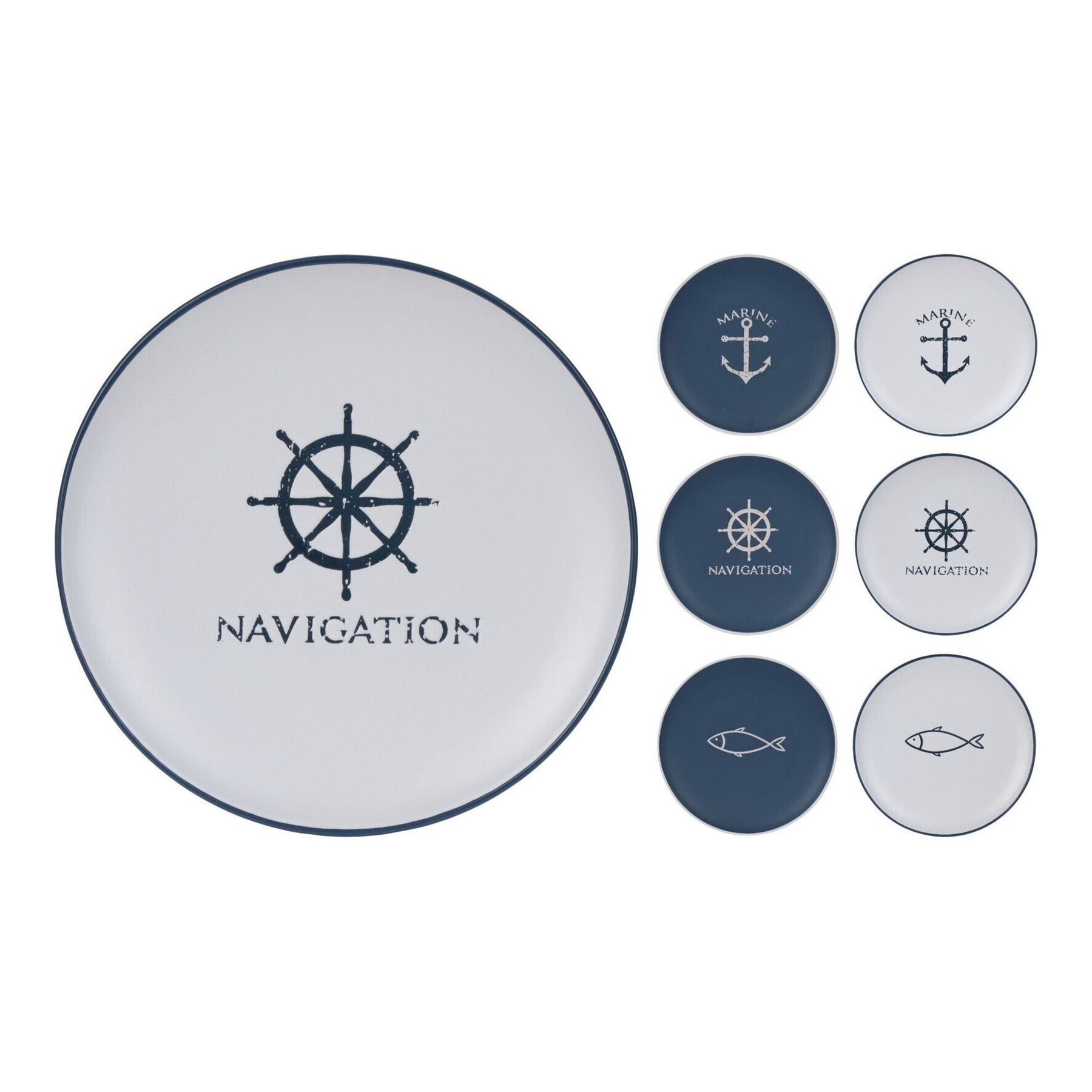 Bring the charm of the sea to your dining table with this set of 6 Assorted Marine Stoneware Plates. Each 7.9-inch plate features unique marine-inspired designs, including 2 fish patterns, 2 navigator motifs, and 2 marine-themed illustrations. Crafted from durable stoneware, these plates are perfect for everyday use or special occasions, adding a nautical touch to your table setting.