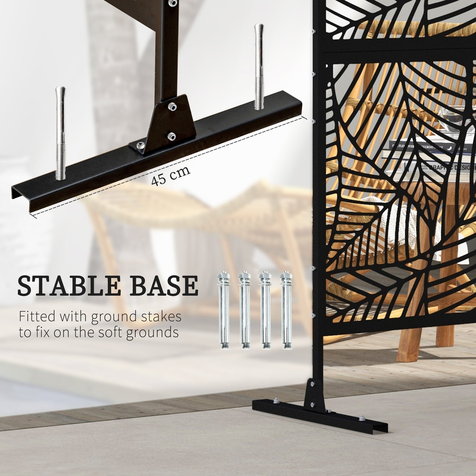 Enhance your outdoor space with this practical and portable decorative divider screen, ideal for segmenting large yards or creating enclosed pathways with ease and elegance. Designed with a beautiful leaf motif, the screen not only provides privacy but also allows sunlight to filter through, casting charming shadows that add a touch of artistry to your garden or patio. More than just a divider, this unit doubles as a trellis—perfect for growing climbing plants like tomatoes, grapes, or ivy, turning your yard into a lush, green retreat. Built for the outdoors, the screen is crafted from durable solid steel with a protective painted finish, ensuring excellent resistance to water and wind. Wide feet and expansion screws provide superior stability, keeping the screen firmly in place even on breezy days. Consisting of three vertical panels, each measuring 23.6" x 47.2", the full unit extends to 48" in length, 17.7" in width, and 78" in height—making it a striking and functional feature for any garden or patio.