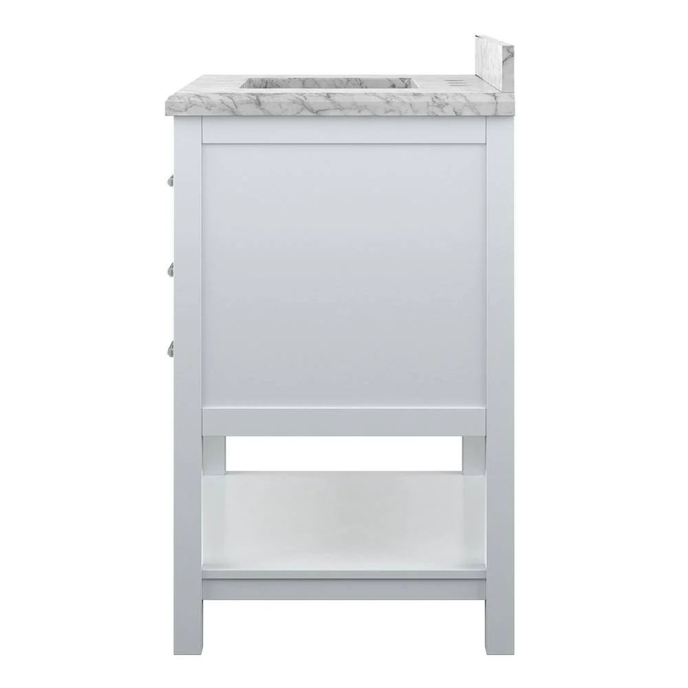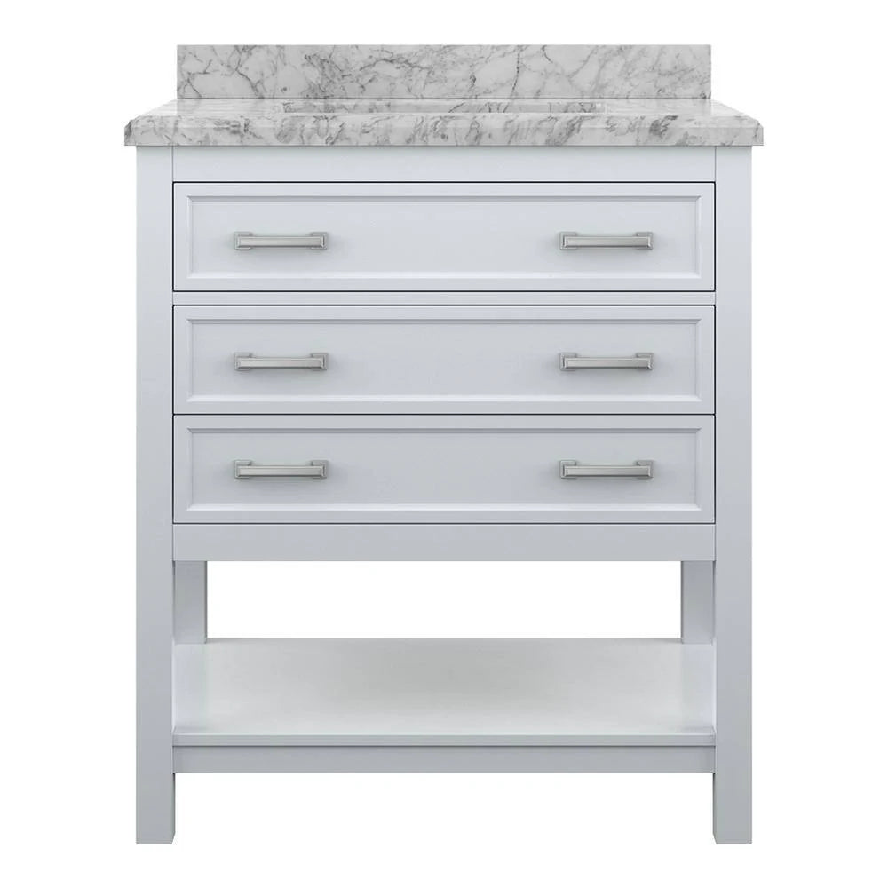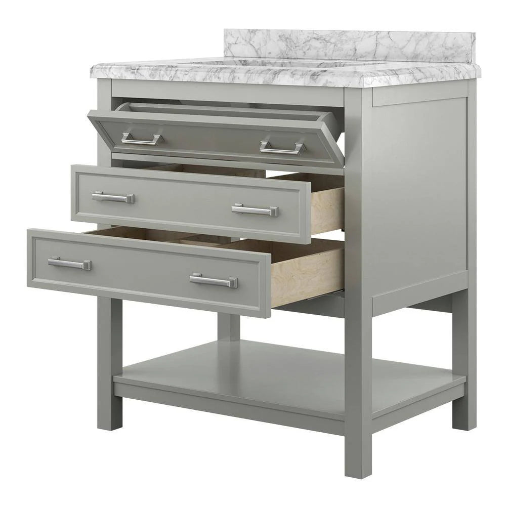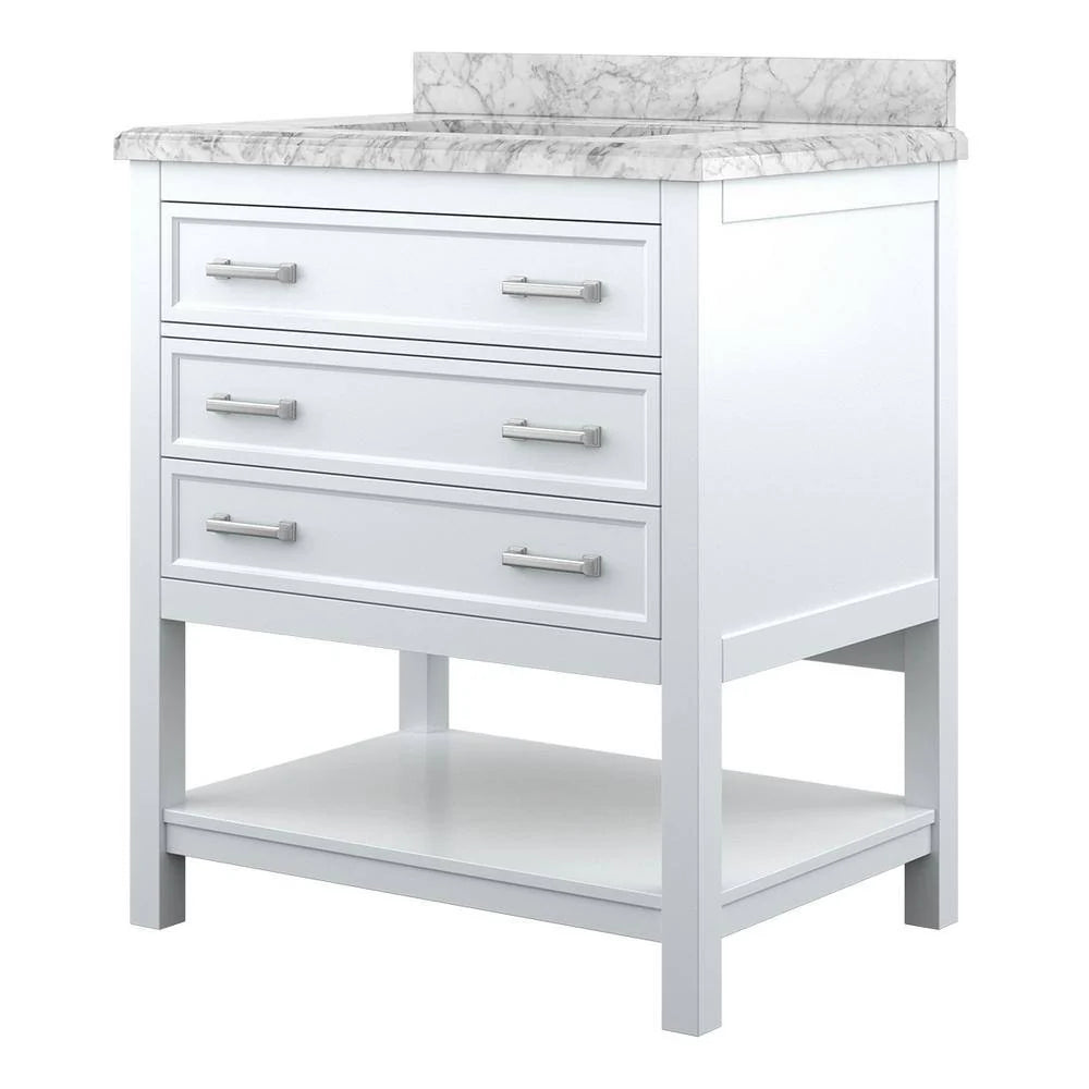 The Affinity 31" Single Sink Vanity with White & Gray Carrara Marble Top is a stunning addition to any bathroom, combining timeless beauty and practical functionality. The 31-inch size strikes a perfect balance between compactness and counter space, making it ideal for medium-sized bathrooms or guest bathrooms. The luxurious Gray Carrara marble top boasts natural veining that adds an upscale touch to the vanity’s elegant white finish. This high-quality marble surface is durable and easy to maintain, providing long-lasting appeal. The vanity includes a spacious storage cabinet below the sink, allowing for organized storage of toiletries and bathroom essentials. With its versatile design, the Affinity vanity fits seamlessly into both traditional and contemporary bathroom decors.
