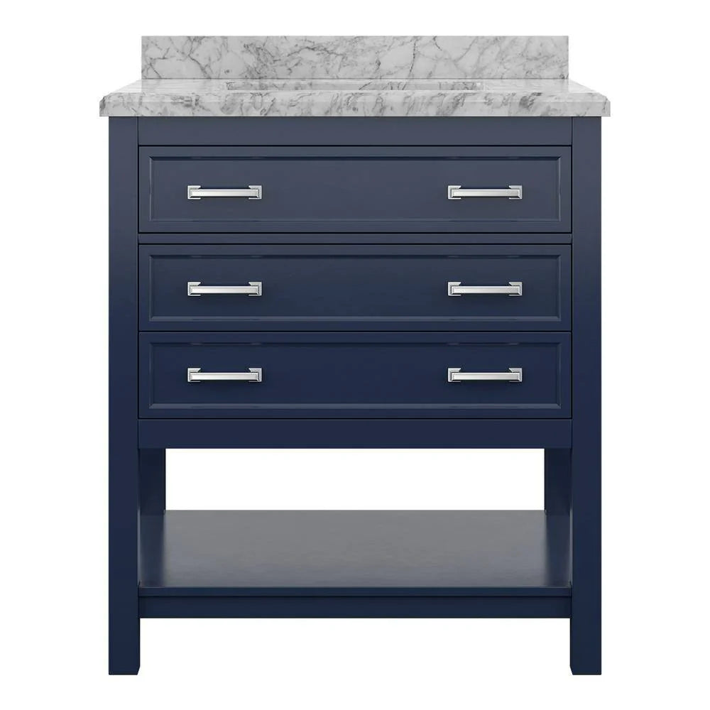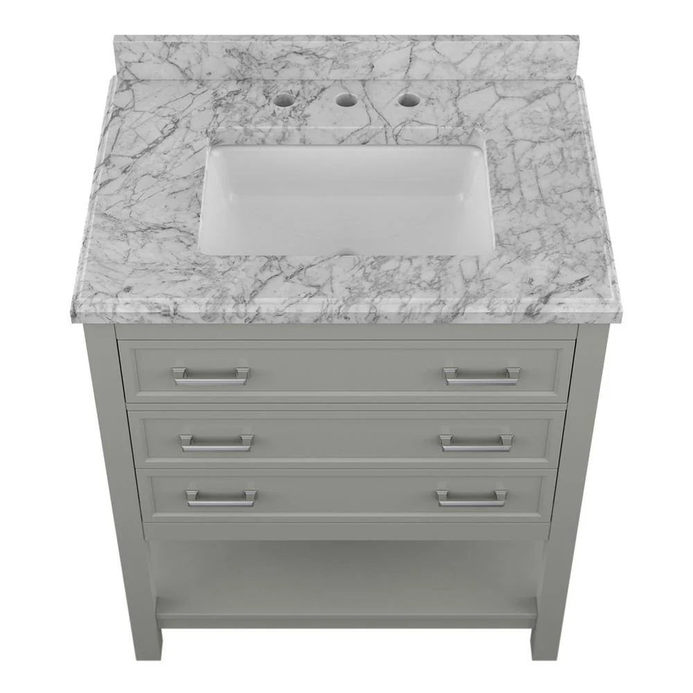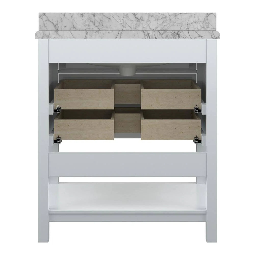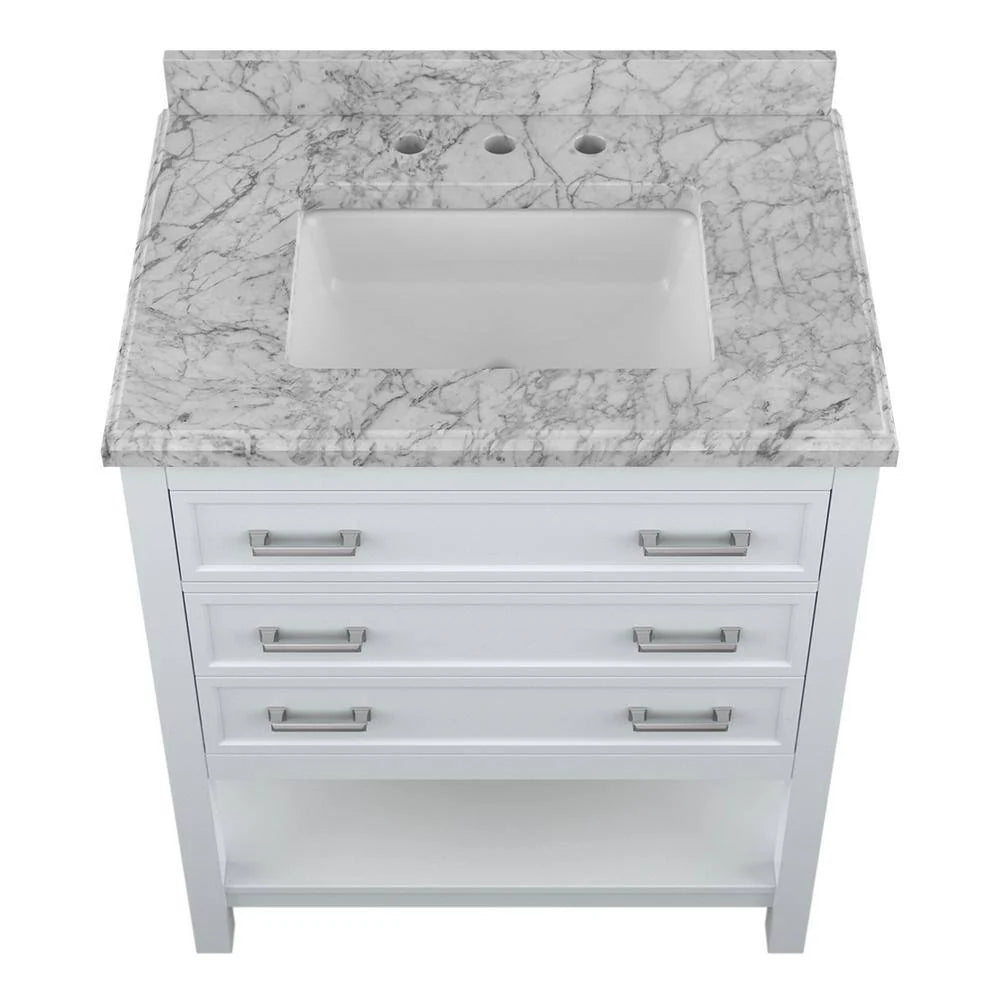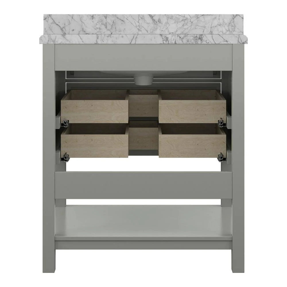 The Affinity 31" Single Sink Vanity with White & Gray Carrara Marble Top is a stunning addition to any bathroom, combining timeless beauty and practical functionality. The 31-inch size strikes a perfect balance between compactness and counter space, making it ideal for medium-sized bathrooms or guest bathrooms. The luxurious Gray Carrara marble top boasts natural veining that adds an upscale touch to the vanity’s elegant white finish. This high-quality marble surface is durable and easy to maintain, providing long-lasting appeal. The vanity includes a spacious storage cabinet below the sink, allowing for organized storage of toiletries and bathroom essentials. With its versatile design, the Affinity vanity fits seamlessly into both traditional and contemporary bathroom decors.