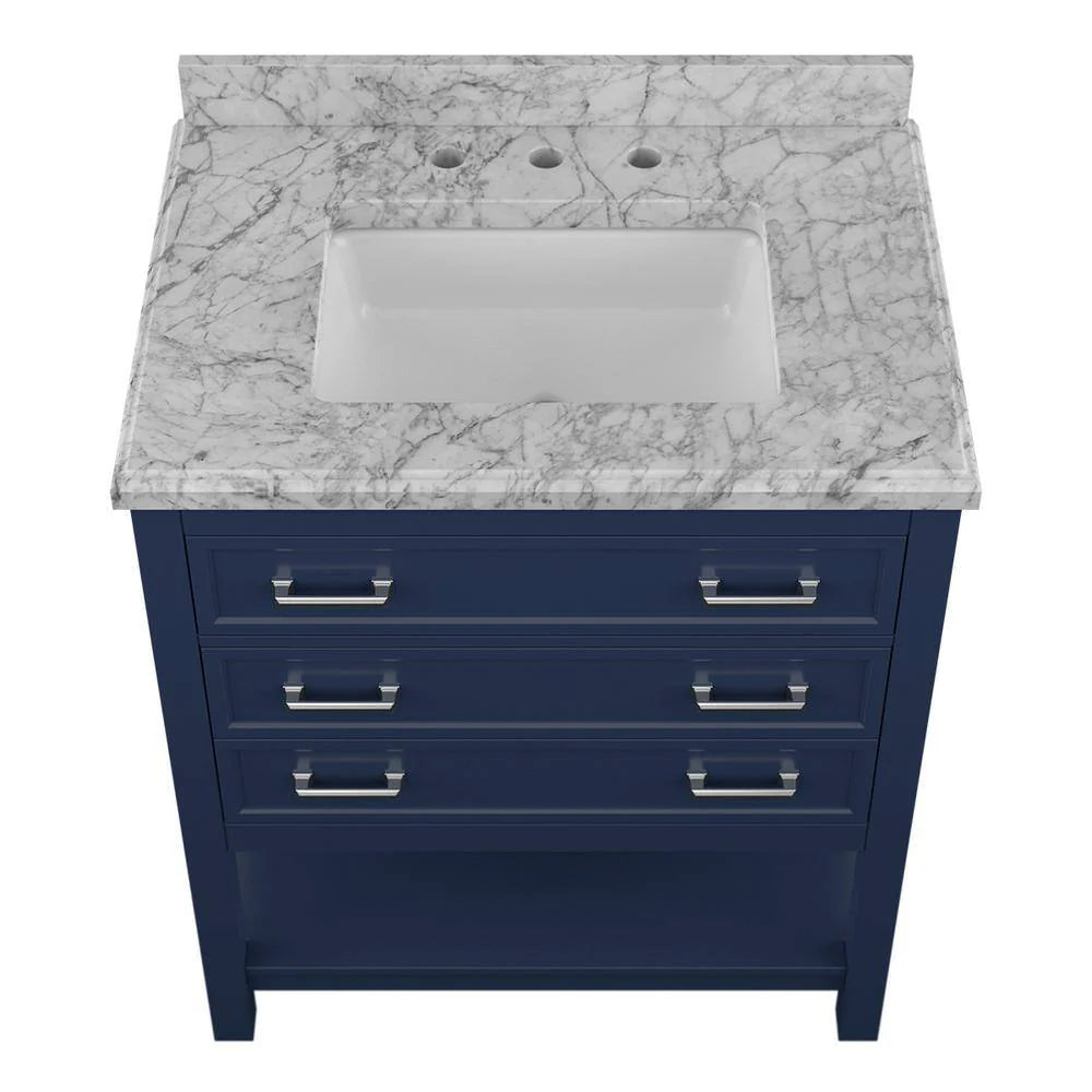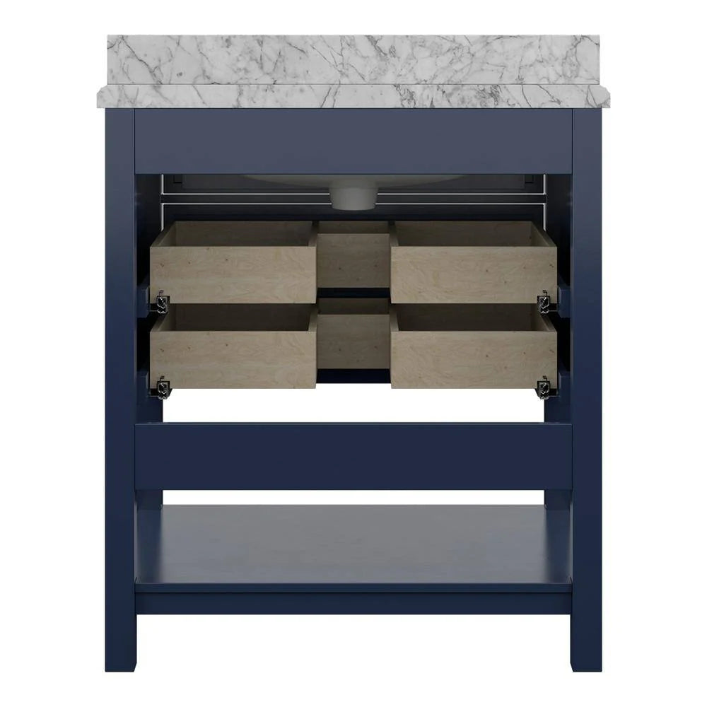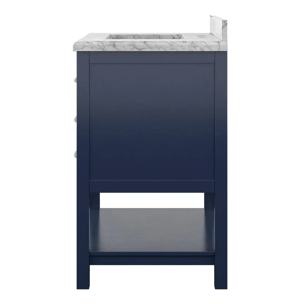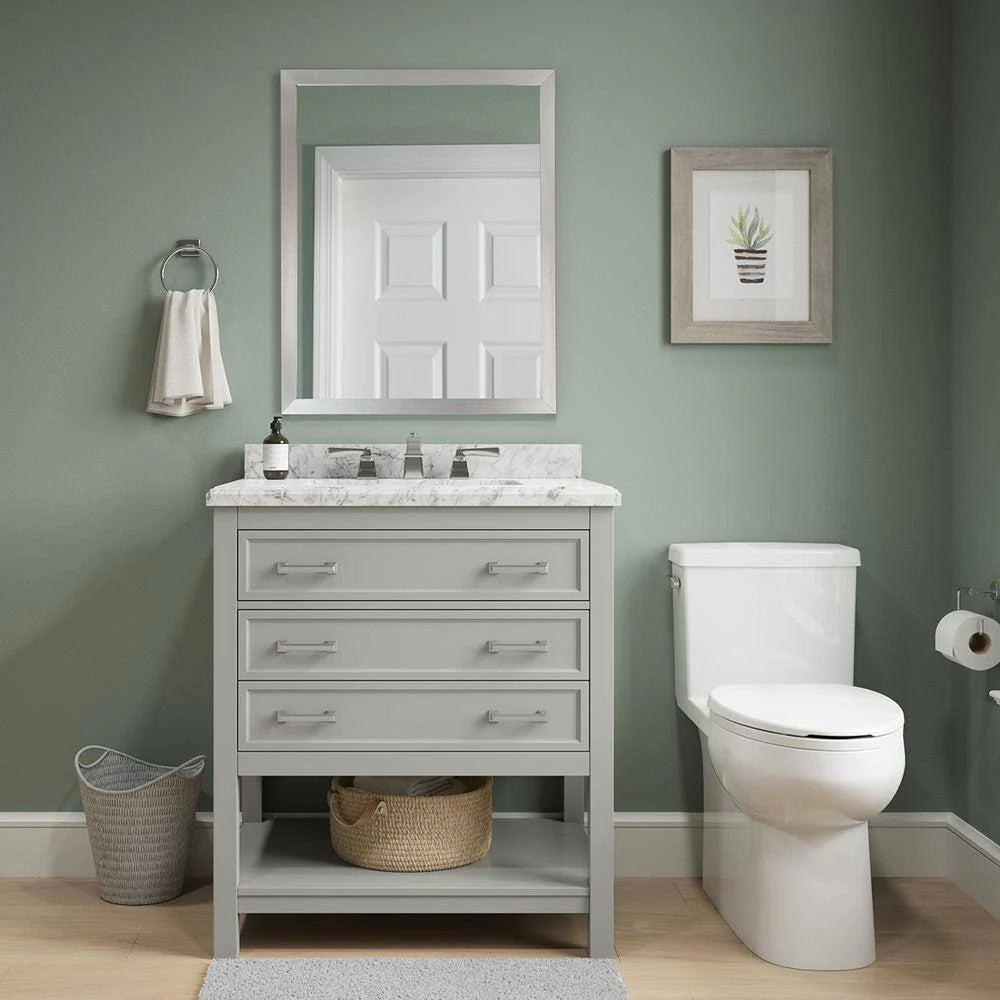 The Affinity 31" Single Sink Vanity with White & Gray Carrara Marble Top is a stunning addition to any bathroom, combining timeless beauty and practical functionality. The 31-inch size strikes a perfect balance between compactness and counter space, making it ideal for medium-sized bathrooms or guest bathrooms. The luxurious Gray Carrara marble top boasts natural veining that adds an upscale touch to the vanity’s elegant white finish. This high-quality marble surface is durable and easy to maintain, providing long-lasting appeal. The vanity includes a spacious storage cabinet below the sink, allowing for organized storage of toiletries and bathroom essentials. With its versatile design, the Affinity vanity fits seamlessly into both traditional and contemporary bathroom decors.