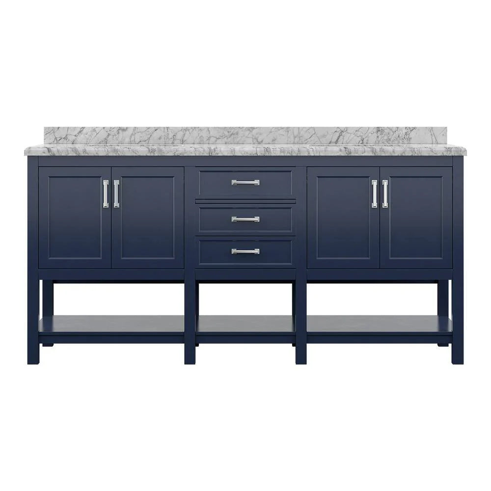 Enhance your bathroom space with the Affinity 72" Double Sink Vanity, a perfect blend of luxury and practicality. Featuring an expansive white and gray Carrara marble top, this elegant vanity offers ample room for two users, making it ideal for master bathrooms or shared spaces. The marble surface brings timeless sophistication and durability, while the sleek design ensures it complements both traditional and modern aesthetics. Equipped with a combination of drawers and cabinets, this vanity provides generous storage space to keep your bathroom organized and clutter-free.