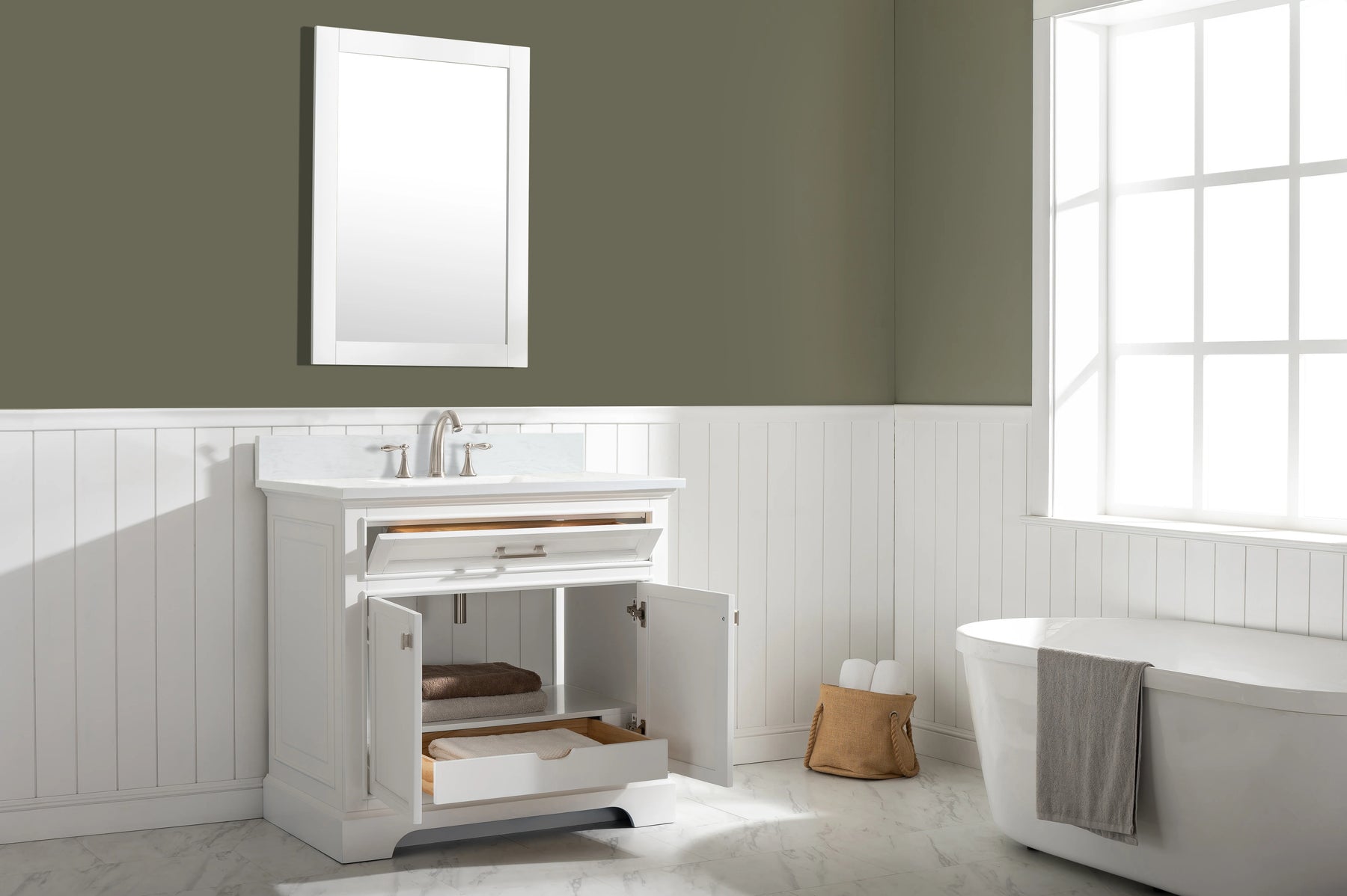The Milano 36" Single Sink Vanity with White Quartz Top is the perfect blend of style, durability, and functionality. Featuring a pristine white quartz countertop, this vanity offers a sleek, modern look that complements any bathroom decor. The durable quartz surface is scratch and stain-resistant, ensuring easy maintenance and lasting beauty. With a spacious cabinet for storage, this 36" vanity provides ample room for all your bathroom essentials while maintaining a clean, organized space. Whether you’re renovating a guest bath or master bathroom, the Milano Vanity delivers both elegance and practicality.