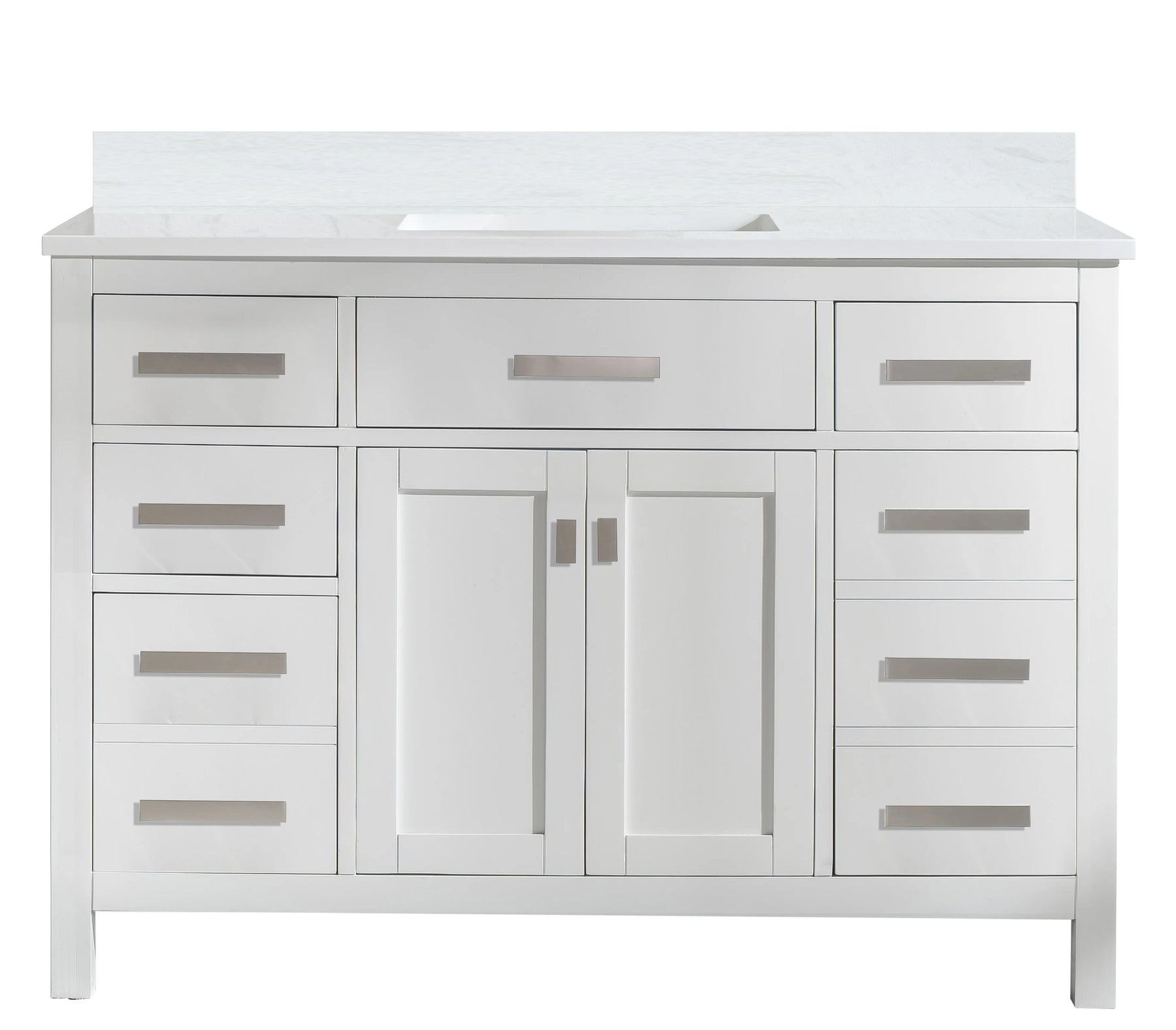 The Valentino 48" Single Sink Vanity with White Quartz Top is the ultimate combination of elegance, durability, and functionality, perfect for transforming your bathroom into a luxurious retreat. Featuring a high-quality white quartz top, this vanity offers a sleek, modern aesthetic while providing a non-porous, stain-resistant surface that is easy to clean. The 48" size provides generous counter space, ideal for organizing bathroom essentials, while the spacious cabinet below offers ample storage. Whether your bathroom is modern or traditional, the Valentino Vanity's timeless design will enhance any decor.