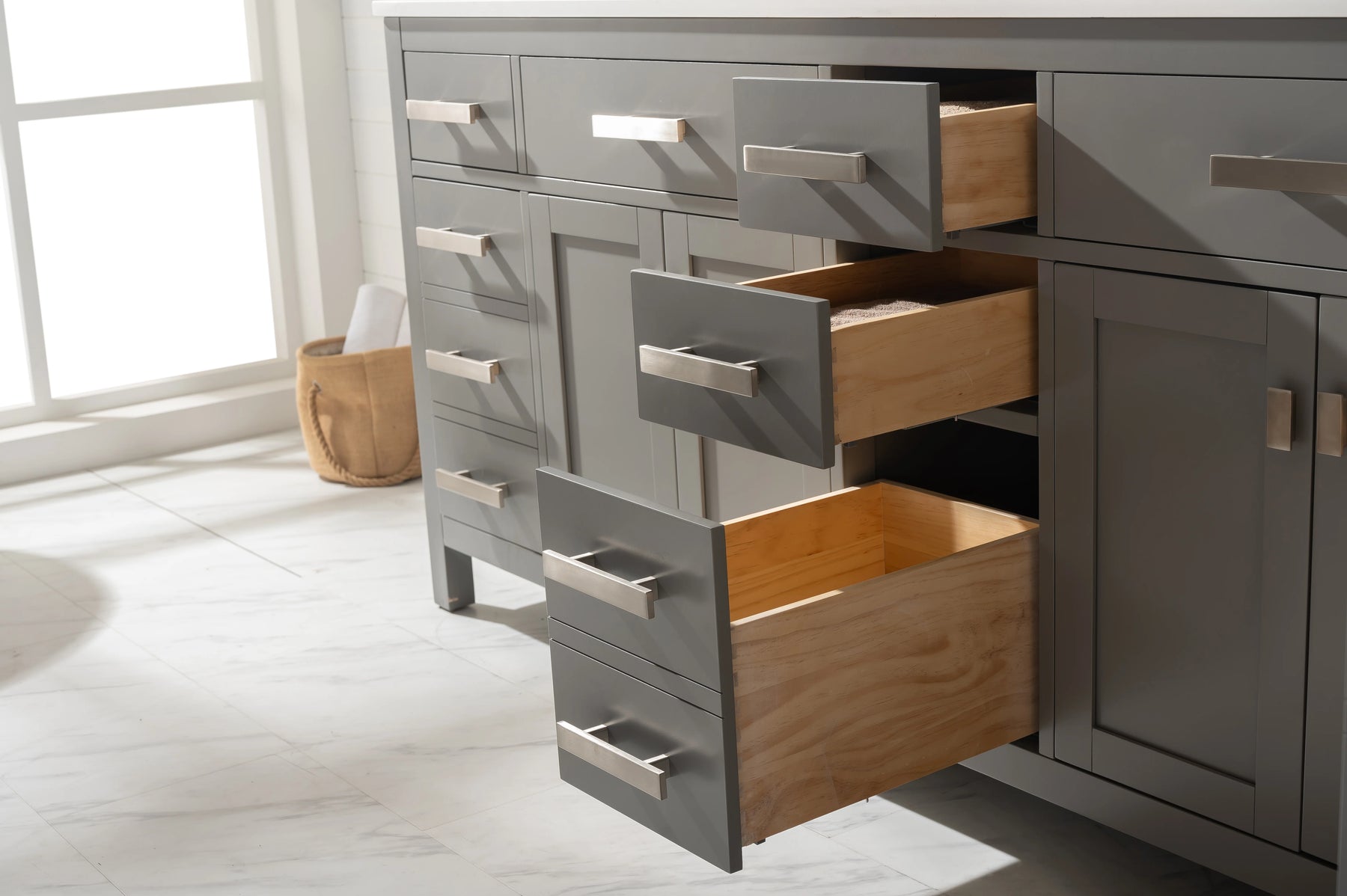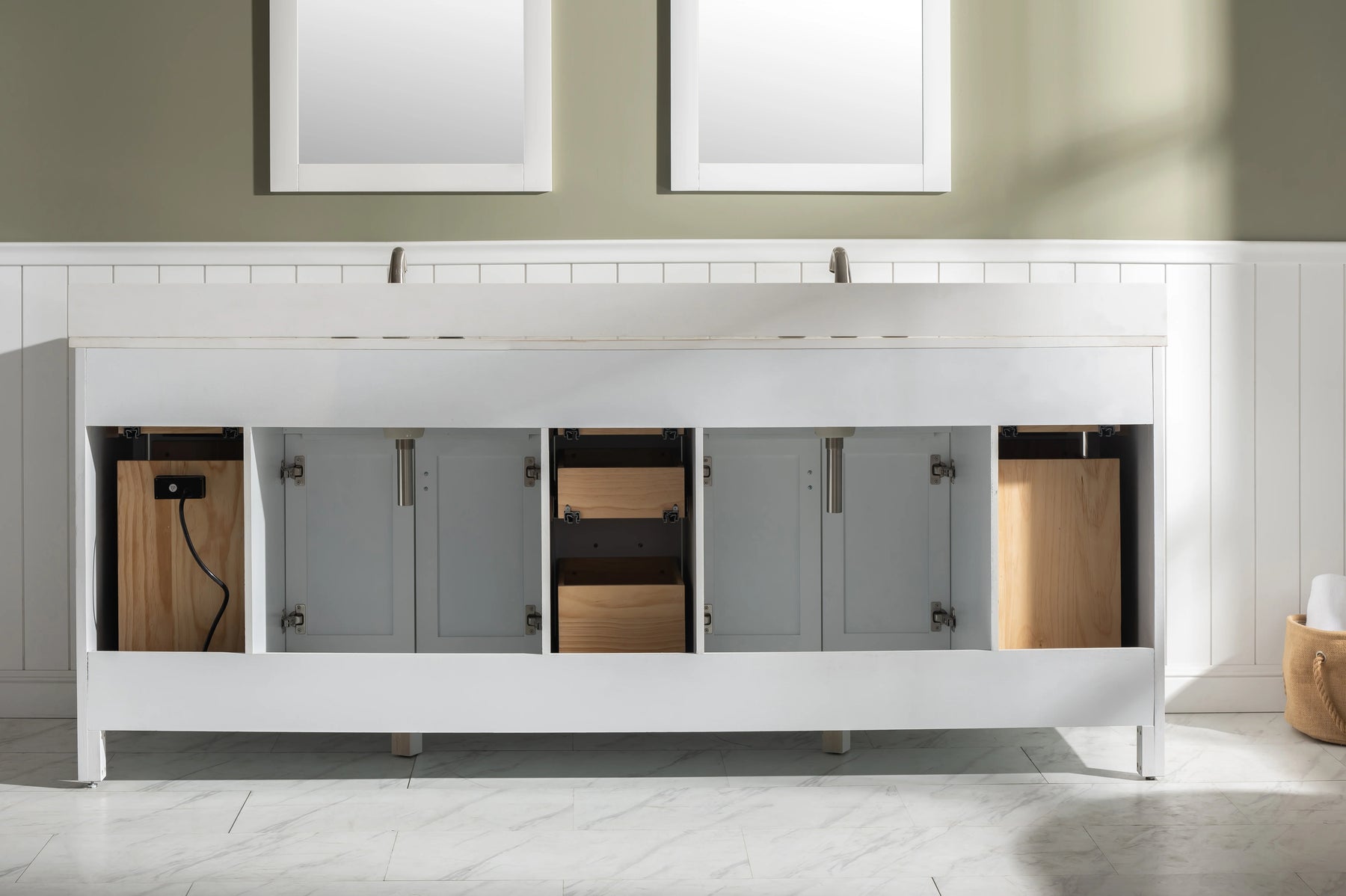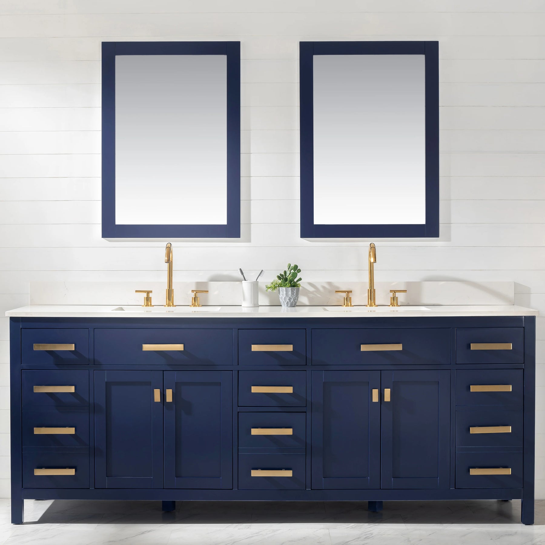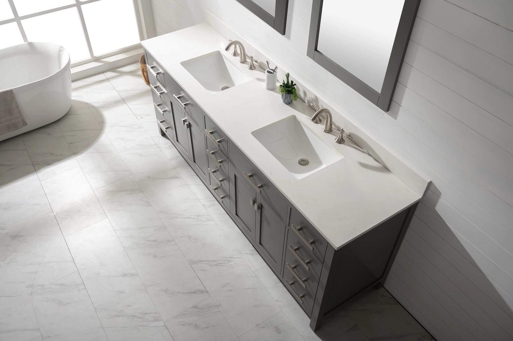 The Valentino 84" Double Sink Vanity with White Quartz Top is the ultimate statement piece for any large bathroom, offering unmatched elegance and practicality. Designed to provide both style and function, this vanity features a sleek white quartz top that is stain-resistant, durable, and easy to maintain. At 84 inches, it provides ample counter space for two sinks, making it perfect for shared bathrooms or master suites. The vanity is equipped with generous storage, including multiple cabinets, to keep your bathroom organized and clutter-free. Its modern design seamlessly complements a variety of bathroom decors, making it a perfect addition to your luxurious bathroom.