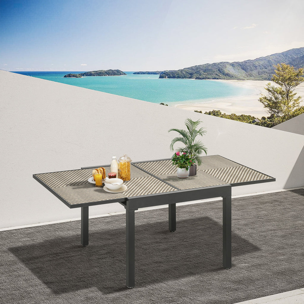 Add style and functionality to your outdoor space with this versatile retractable patio wicker dining table. Designed for flexibility, the table features a retractable top that smoothly extends from 35.4" to 70.9", easily accommodating 4 to 8 guests—perfect for family meals, friendly gatherings, or backyard events. The tabletop is crafted with an elegant ribbed rattan weave, blending sophistication with all-weather durability, making it suitable for both indoor and outdoor use. A sturdy aluminum frame and metal legs provide excellent stability and support, with a weight capacity of up to 154 lbs. The table is easy to assemble with all necessary hardware included, so you can enjoy its sleek, modern charm in no time. Whether placed on a patio, balcony, or garden, this rattan dining table offers comfort, convenience, and timeless appeal.