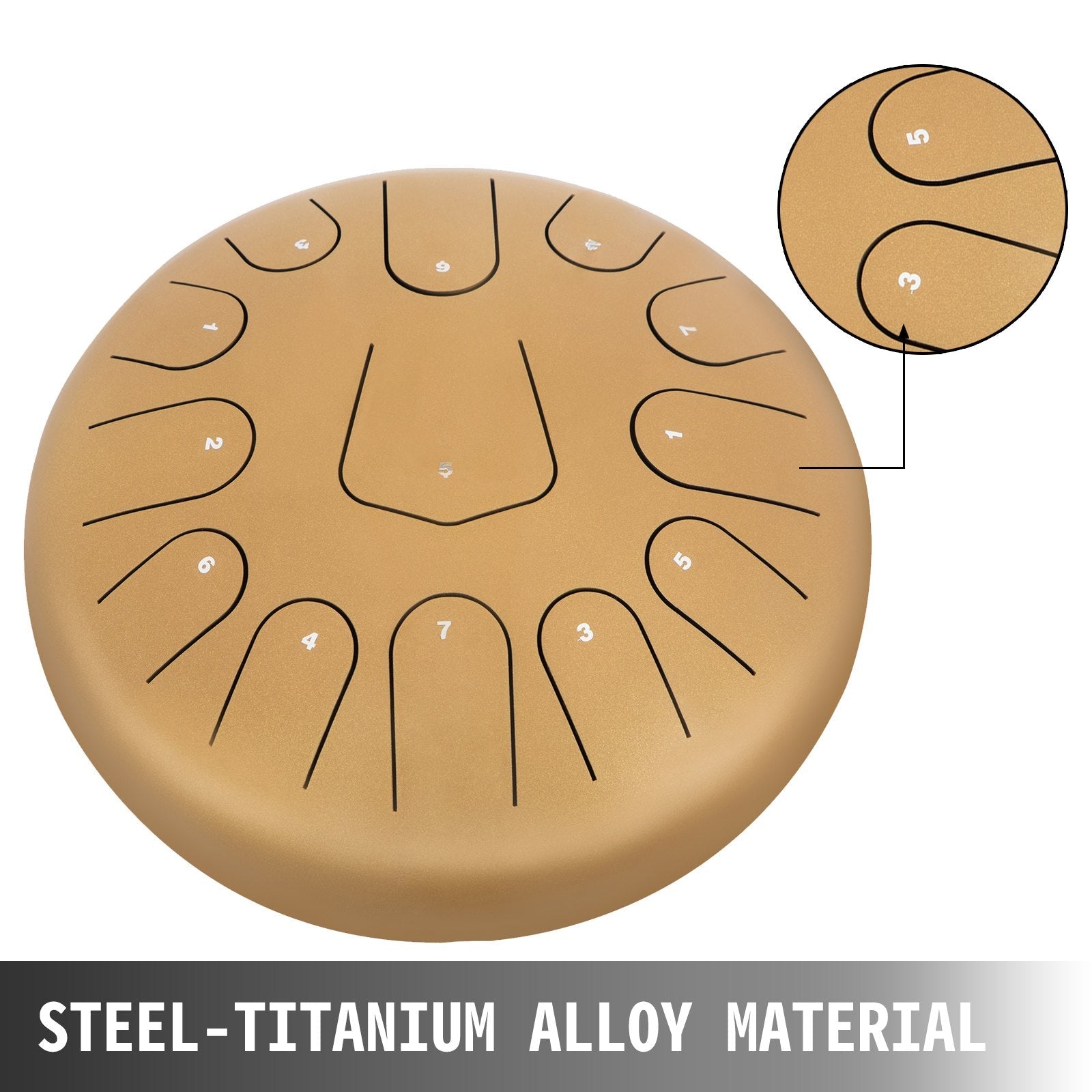 The VEVOR 12-Inch Steel Tongue Drum is a finely crafted percussion instrument designed to produce rich, meditative tones. Featuring 13 precisely tuned notes, this golden drum is suitable for both beginners and seasoned musicians. Whether used for relaxation, musical exploration, or spiritual healing, it delivers a soothing and resonant sound. The drum comes complete with a carrying bag, mallets, music book, and a mallet bracket—everything you need for a fulfilling playing experience. Built from durable steel, it's made to last and look beautiful in any setting.