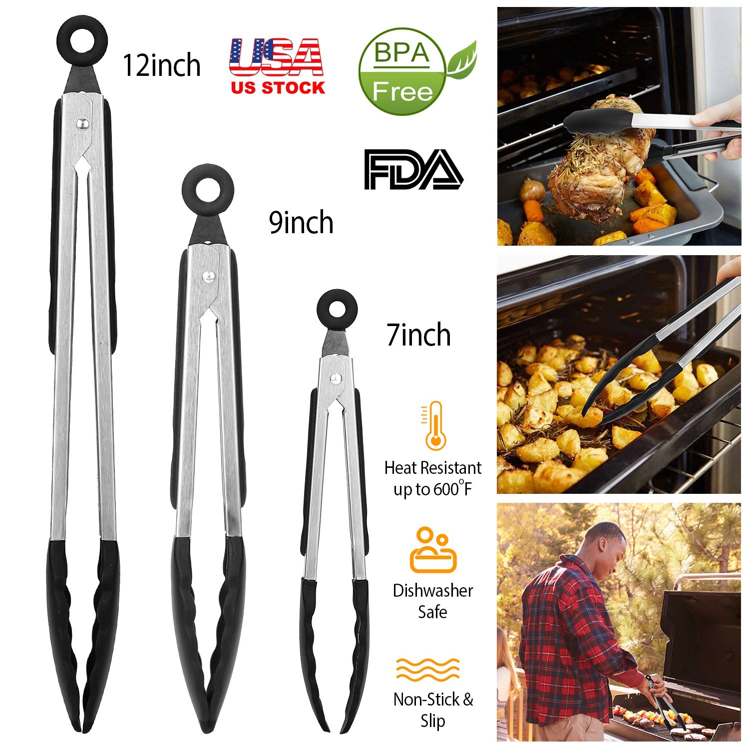 Discover the convenience and reliability of our FDA-certified silicone tongs, crafted from premium food-grade silicone that's BPA-free and odorless. Perfect for indoor cooking and outdoor BBQs, these tongs are designed to withstand high temperatures up to 600 degrees Fahrenheit without melting, ensuring safety and peace of mind while cooking.