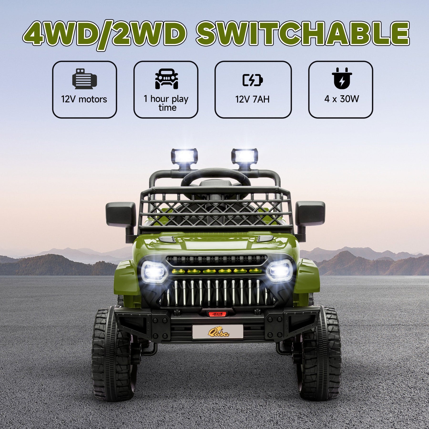This kids' electric car is the ultimate ride-on vehicle for young adventurers, combining thrilling off-road capabilities with a smooth and fun driving experience. Equipped with a 12V four-motor system and a powerful 12V 7AH battery, it offers up to 1 hour of ride time. The car seamlessly switches between 4x4 drive and 2x2 drive, allowing for an adaptable and exciting driving experience across different terrains. Featuring six wheels, four of which are shock-absorbing for extra bounce, this ride-on car ensures a smooth ride over flat surfaces like concrete and asphalt. The gentle soft start and safety belt ensure that little drivers are both comfortable and secure as they cruise along. Offering three selectable speeds ranging from 1.6 mph to 2.5 mph (2.5-4 km/h), this electric car allows children to drive manually, or parents can take control using the included remote. With additional fun features like built-in music, horn, lights, one-button start, and a handy rear trailer for storage, every ride becomes an adventure. Constructed from robust plastic and steel, this car is built to last and is suitable for children aged 3-8 years, meeting the SOR standard for safety.