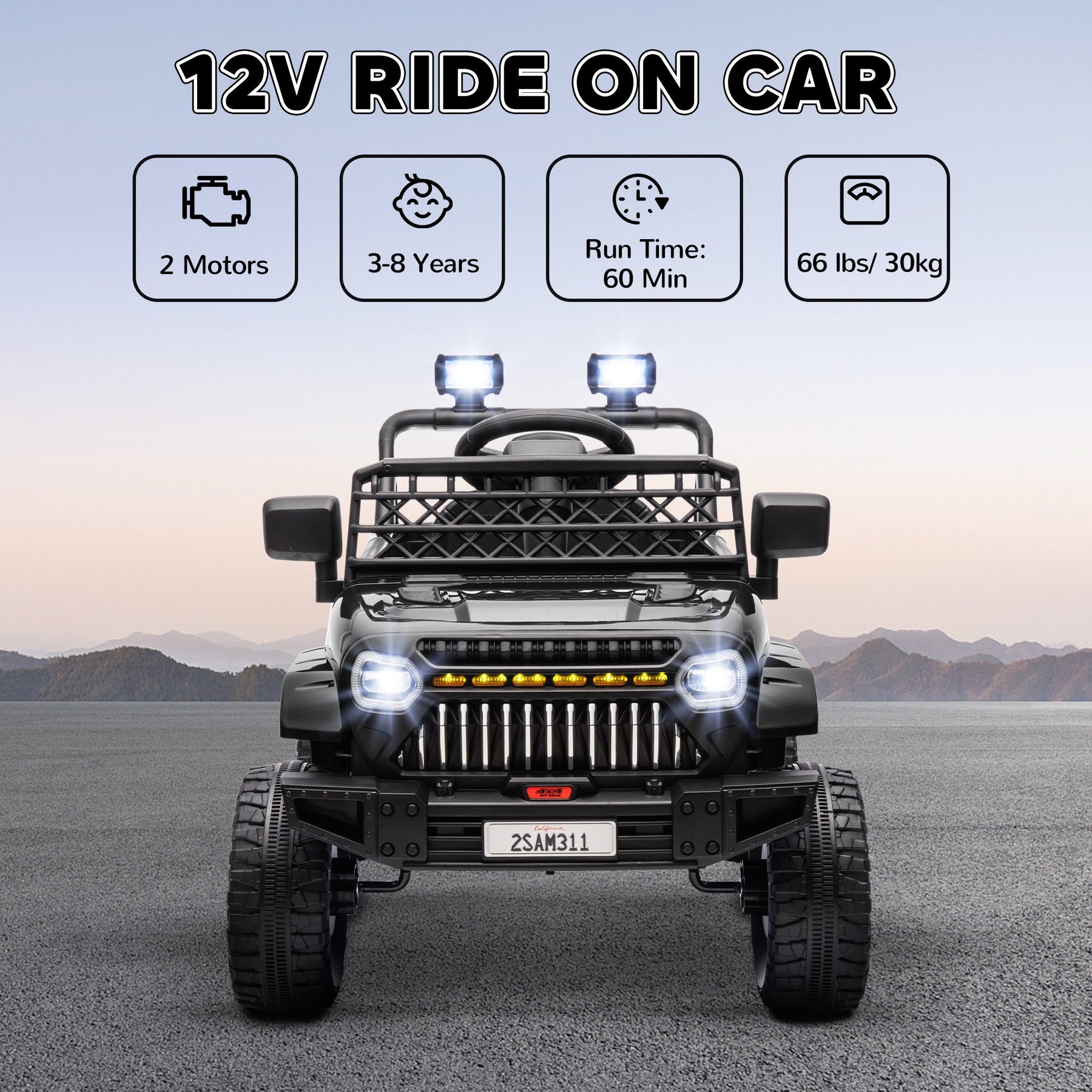 Give your child the thrill of driving with this 12V kids ride-on car, designed for an exciting and safe experience. Powered by dual motors, it offers a continuous 60-minute run time, ensuring extended playtime for non-stop fun. Equipped with four spring-loaded suspension wheels, this ride-on car provides a smooth, stable ride on various surfaces like cement and gravel. The car features a slow start function to ensure a gentle and secure acceleration for young drivers. Parents can maintain full control with the included remote, offering three adjustable speeds (1.9-3.1 mph or 3-5 km/h), while allowing kids to gradually develop independence as they grow. The car also comes with interactive features like a single start button, built-in USB ports, music options, a horn, and headlights, providing a truly immersive driving experience. With a weight capacity of 66 lbs and dimensions of 37.4"L x 24.6"W x 25.6"H, this electric car is perfect for young adventurers who love to explore.