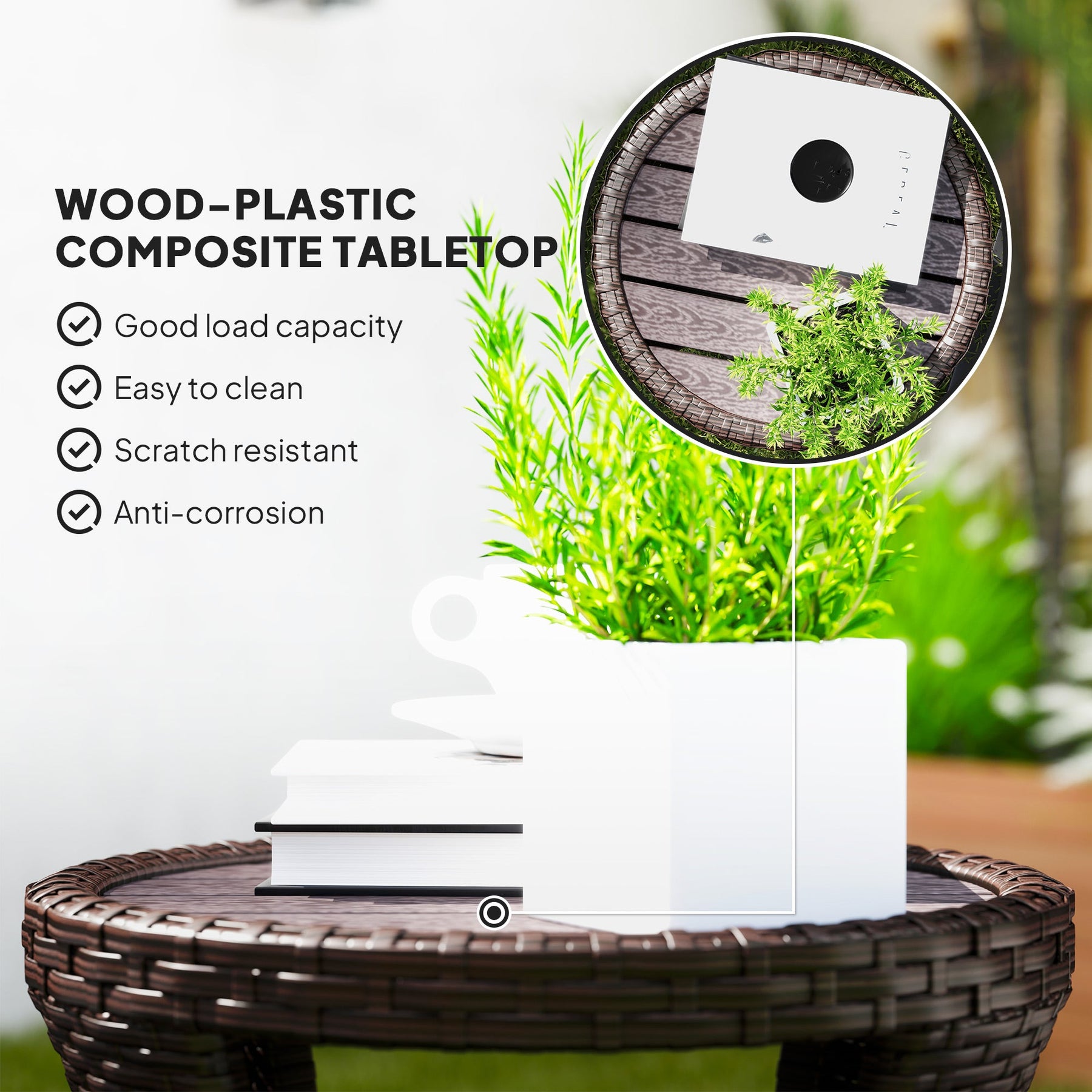 Stylish Table Top: Slatted wood-plastic composite top that resists cracking, rotting, and wear from outdoor elements; easy to clean and maintain.