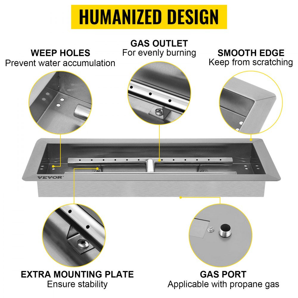 The VEVOR Fire Pit Pan is a compact yet powerful addition to any fire feature, crafted from high-quality stainless steel for durability and a sleek look. Measuring 20 x 8 inches, this rectangular pan comes with a built-in burner designed for efficient flames, compatible with both propane and natural gas. Perfect for indoor and outdoor use, it provides reliable heat and enhances the ambiance of any space with a warm, inviting flame.