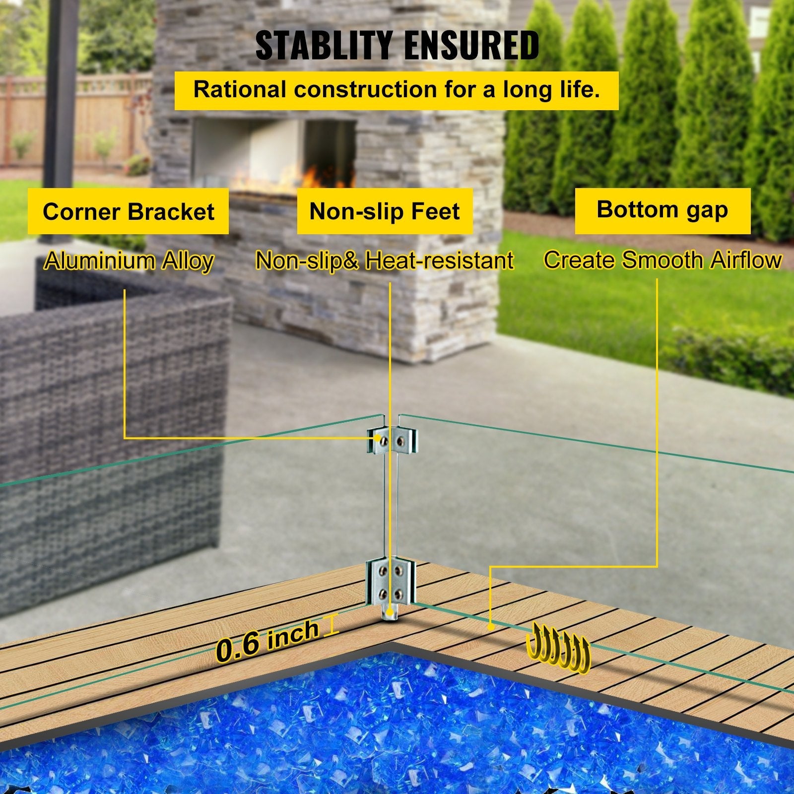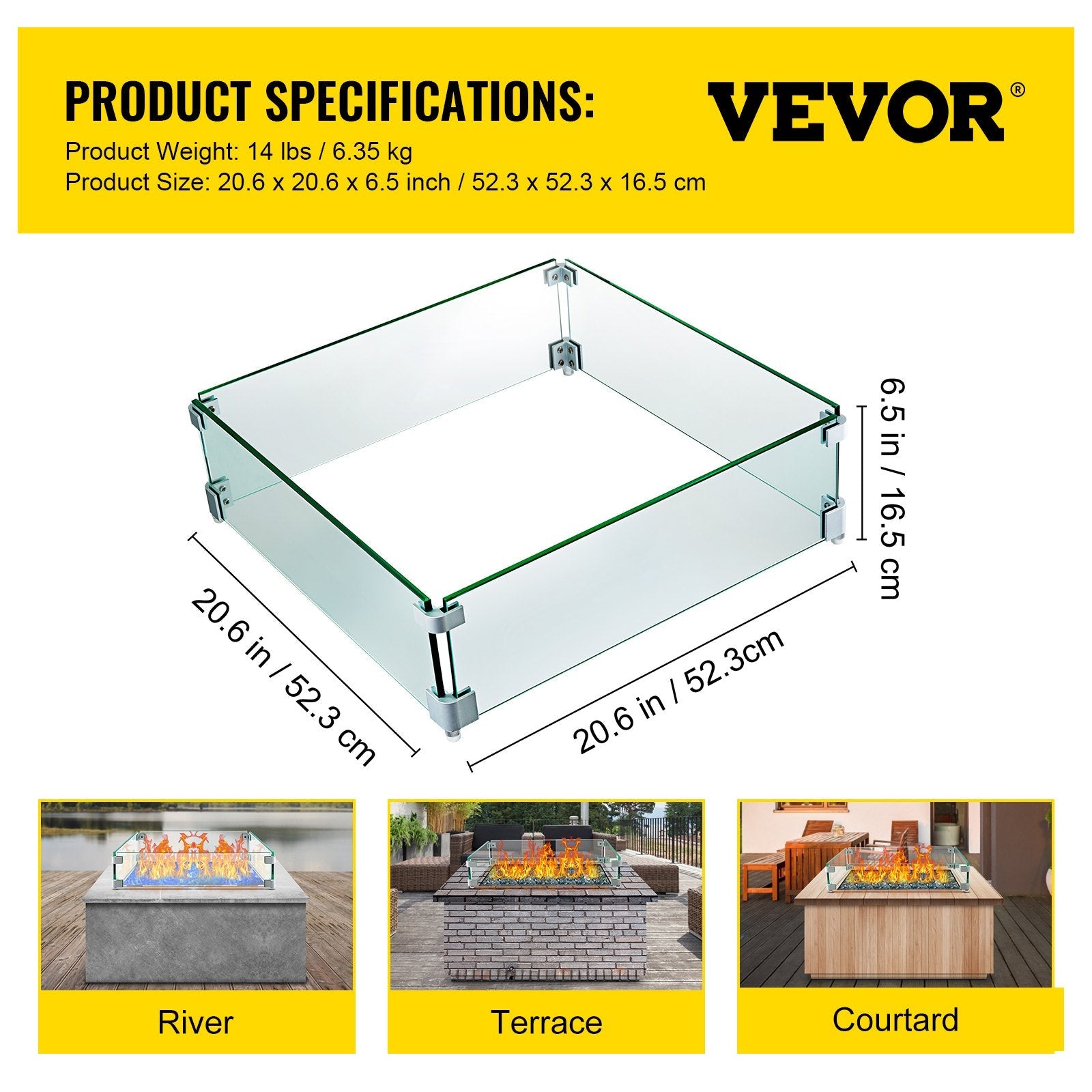 Enhance your outdoor fire pit experience with the VEVOR 21 x 21 Inch Glass Wind Guard. Crafted from 5/16-inch thick tempered glass and supported by sturdy aluminum alloy brackets, this wind guard helps maintain a steady flame by shielding your fire pit from wind. Its sleek, clear panels offer unobstructed views of the flame while adding a modern touch to your fire table or pit. Designed for compatibility with propane or gas fire pit pans and tables, it includes non-slip feet for added stability and safety—perfect for patios, backyards, and outdoor lounges.