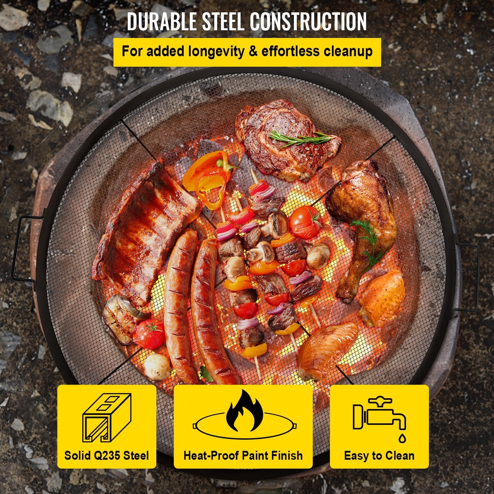 Enhance your outdoor cooking experience with the VEVOR Round Fire Pit Grate, designed for grilling, roasting, and open-flame cooking. With a 25-inch diameter, this heavy-duty grill grate fits most fire pits and campfires, making it ideal for backyard barbecues and camping adventures. The durable black steel construction ensures long-lasting performance, while the X-marks design allows for even cooking and attractive grill marks. Integrated handles provide convenience for safe and easy handling over the fire.