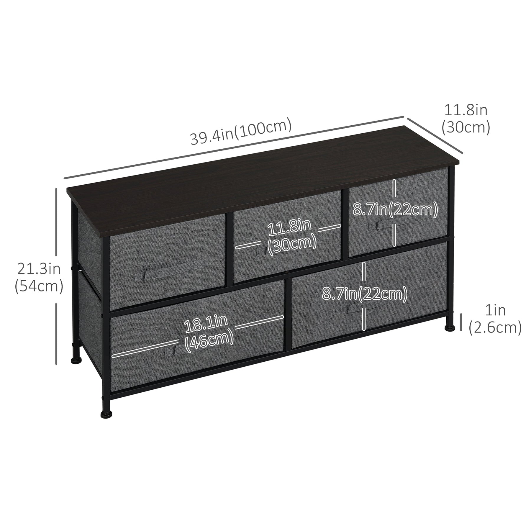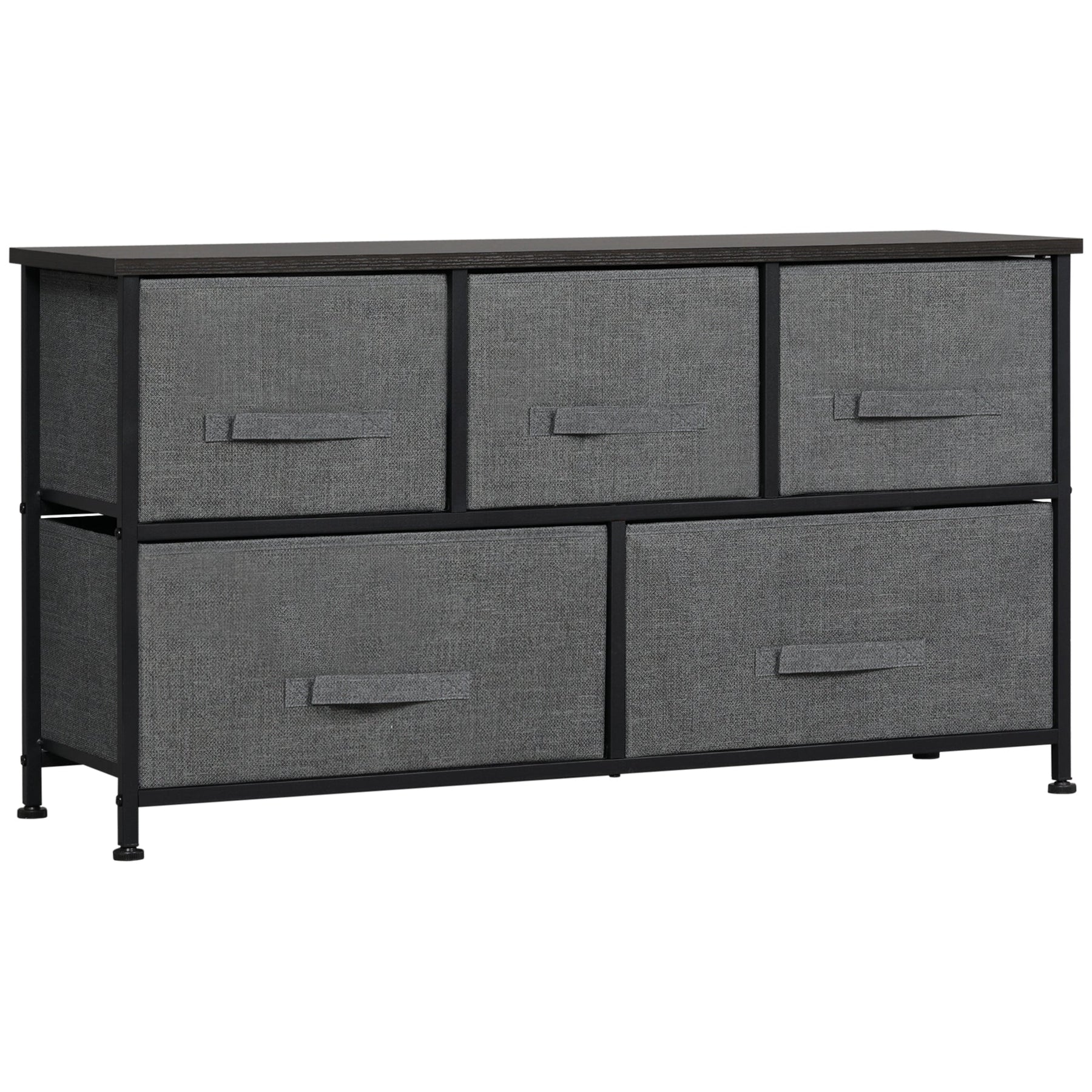 This Elegant 5-Drawer Fabric Dresser is a versatile storage solution designed to blend seamlessly with modern home décor. Featuring linen drawers, chipboard panels, and a sturdy steel frame, this dresser offers a sleek yet durable design perfect for any room. The five pull-out drawers in two sizes provide ample storage space, while the top shelf serves as an additional surface for displaying photos, decorative pieces, or office essentials. The reinforced linen cloth drawers ensure long-lasting durability, and the powder-coated steel frame enhances stability and strength. With a non-slip base, this dresser stays secure on any flooring, making it ideal as a storage cabinet, TV stand, or sideboard in the living room, hallway, bedroom, or office.