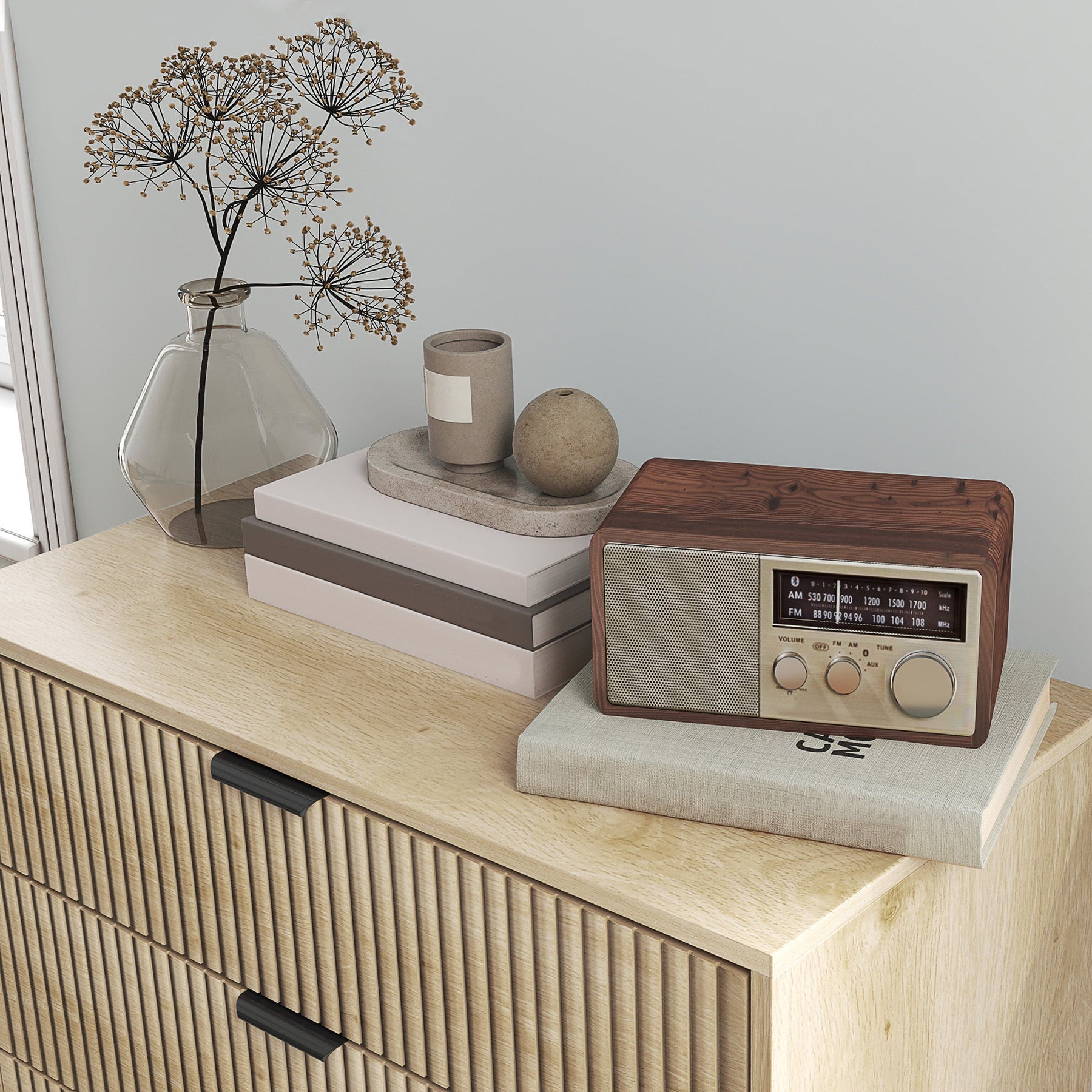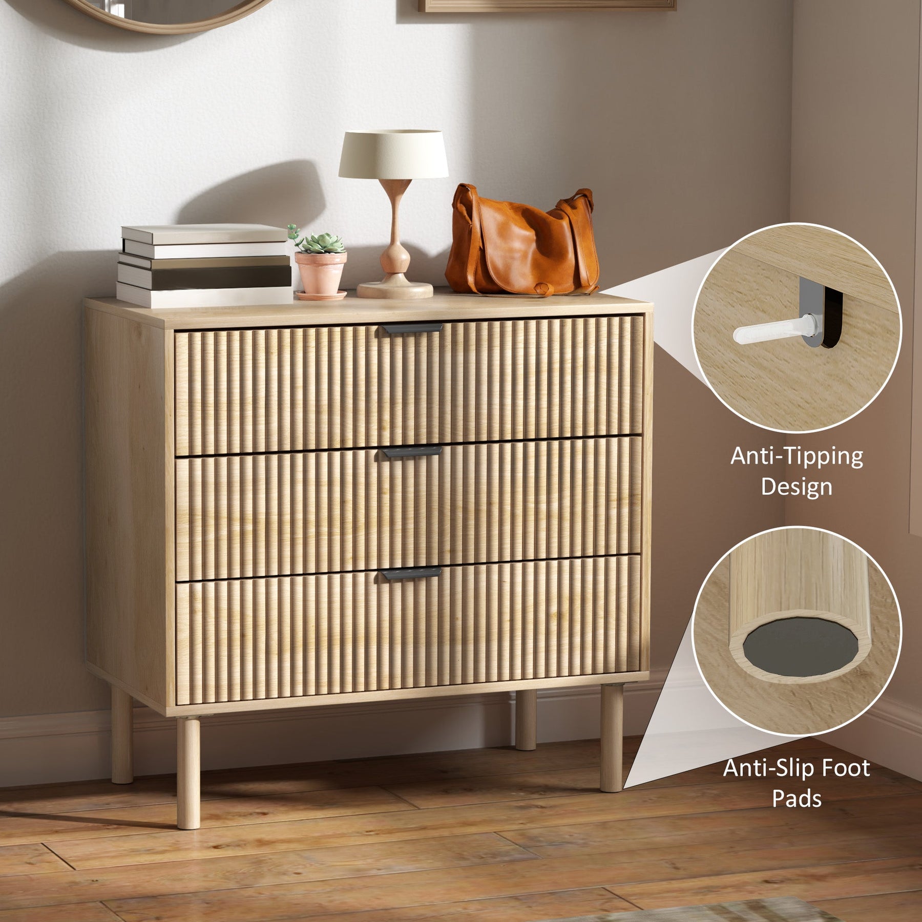 Enhance your bedroom with the timeless appeal of Scandinavian design with this stylish three-drawer dresser. Featuring elegant fluted panels and sleek black metal finger handles, this dresser exudes sophistication while seamlessly blending into any modern or contemporary decor. The spacious drawers and generous top surface provide ample storage for clothing, accessories, and essentials, keeping your space neat and organized. Constructed from durable particleboard with a melamine finish, it offers both longevity and easy maintenance. The robust pine wood legs provide reliable support, while an anti-tipping device and foot pads ensure safety and stability. With an elevated bottom design, cleaning underneath is effortless, making this piece both functional and stylish.