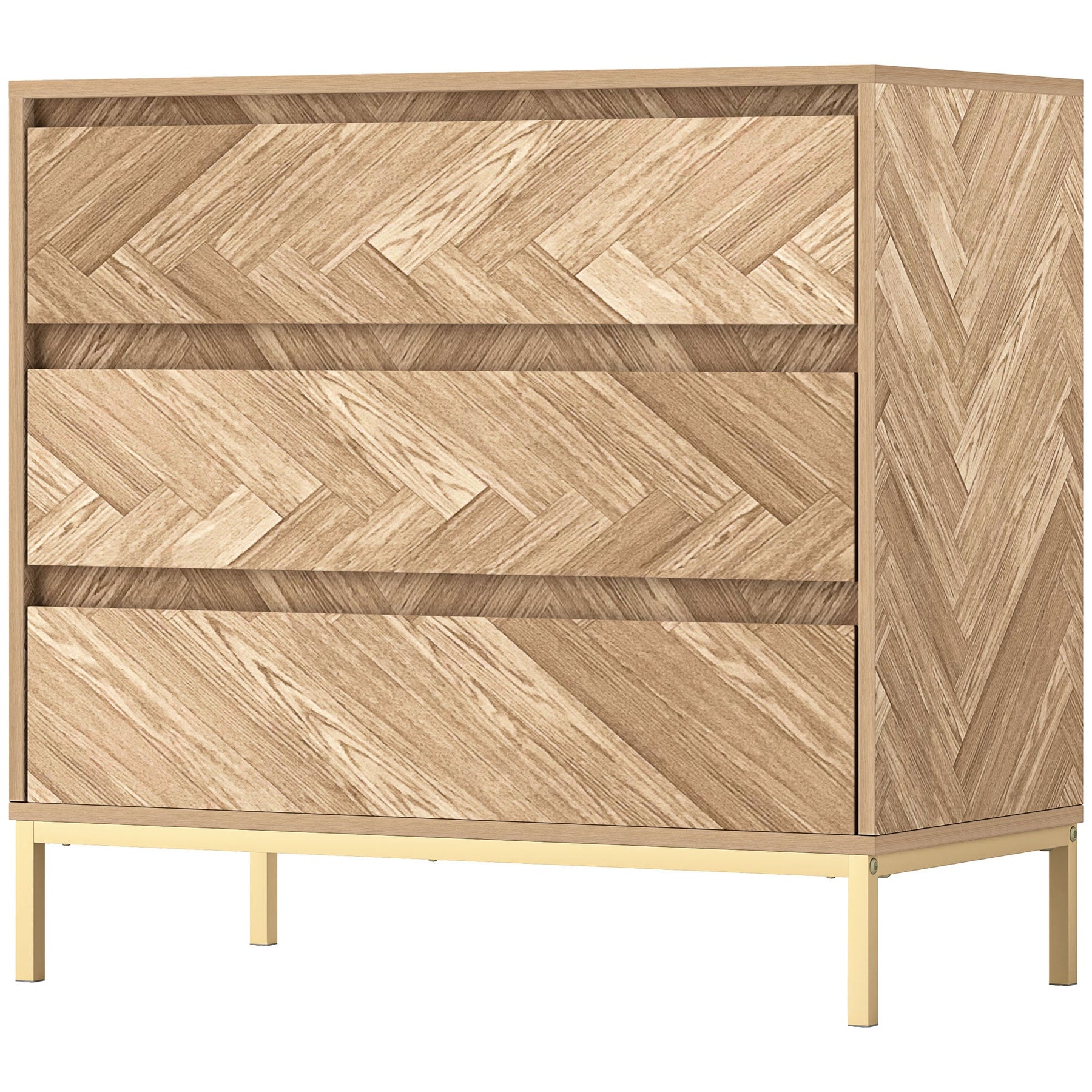 Bring a touch of Nordic elegance to your bedroom with this stylish and functional three-drawer dresser. Featuring a striking chevron pattern and handleless drawer design, this dresser showcases a natural wood finish accented by sleek gold legs, effortlessly complementing any modern or Scandinavian-inspired decor. Its three spacious drawers provide ample storage for clothing, accessories, and other essentials, helping you keep your space organized and clutter-free. Designed with safety in mind, this dresser includes an anti-tipping device and stable foot pads, while the elevated base allows for easy cleaning underneath. Constructed from high-quality particleboard with a veneer surface and supported by powder-coated steel legs, this durable dresser combines style and practicality for long-lasting use.