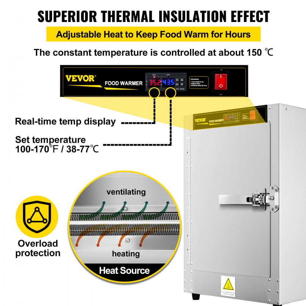Extensive Storage Capacity: With a generous 16"x22"x24" size and four shelves, this warmer can hold a variety of foods, from pizzas to pastries.