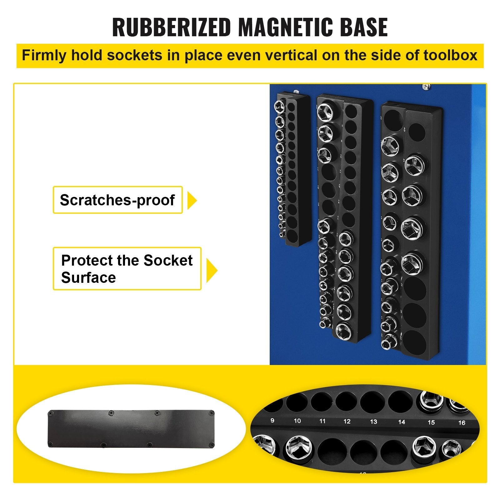 Keep your toolbox neat, organized, and efficient with the VEVOR 3-Pack Metric Magnetic Socket Organizer Set. Designed to hold up to 75 metric sockets across 1/4", 3/8", and 1/2" drive sizes, this heavy-duty ABS plastic organizer securely mounts to metal surfaces without scratching, thanks to its strong yet non-damaging magnetic base. With clearly labeled high-visibility metric markings from 4 mm to 27 mm, finding the right socket has never been faster. Whether you're a DIYer or a professional mechanic, this durable black socket tray set delivers performance, convenience, and space-saving organization.