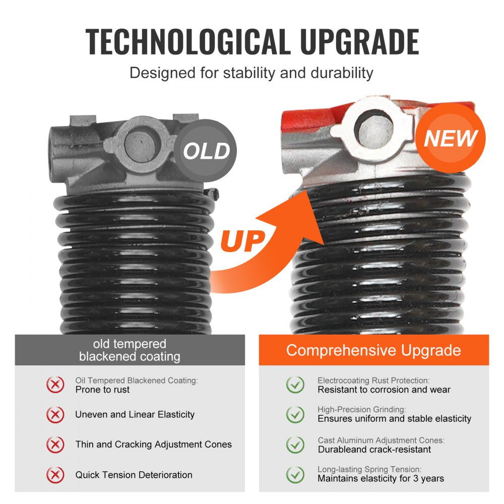 The VEVOR Garage Door Torsion Springs set includes two precision-engineered springs designed for smooth and reliable garage door operation. Each spring measures 0.218" wire diameter by 2" inner diameter and 24" length, built to withstand approximately 16,000 cycles of opening and closing. Made from high carbon steel with an electrophoresis coating, these springs resist corrosion and deliver long-lasting durability. The set comes with non-slip winding bars, gloves, and a mounting wrench for quick and safe installation. Featuring one dextrorotary and one levorotary spring, this kit ensures balanced torsion and enhanced garage door performance.