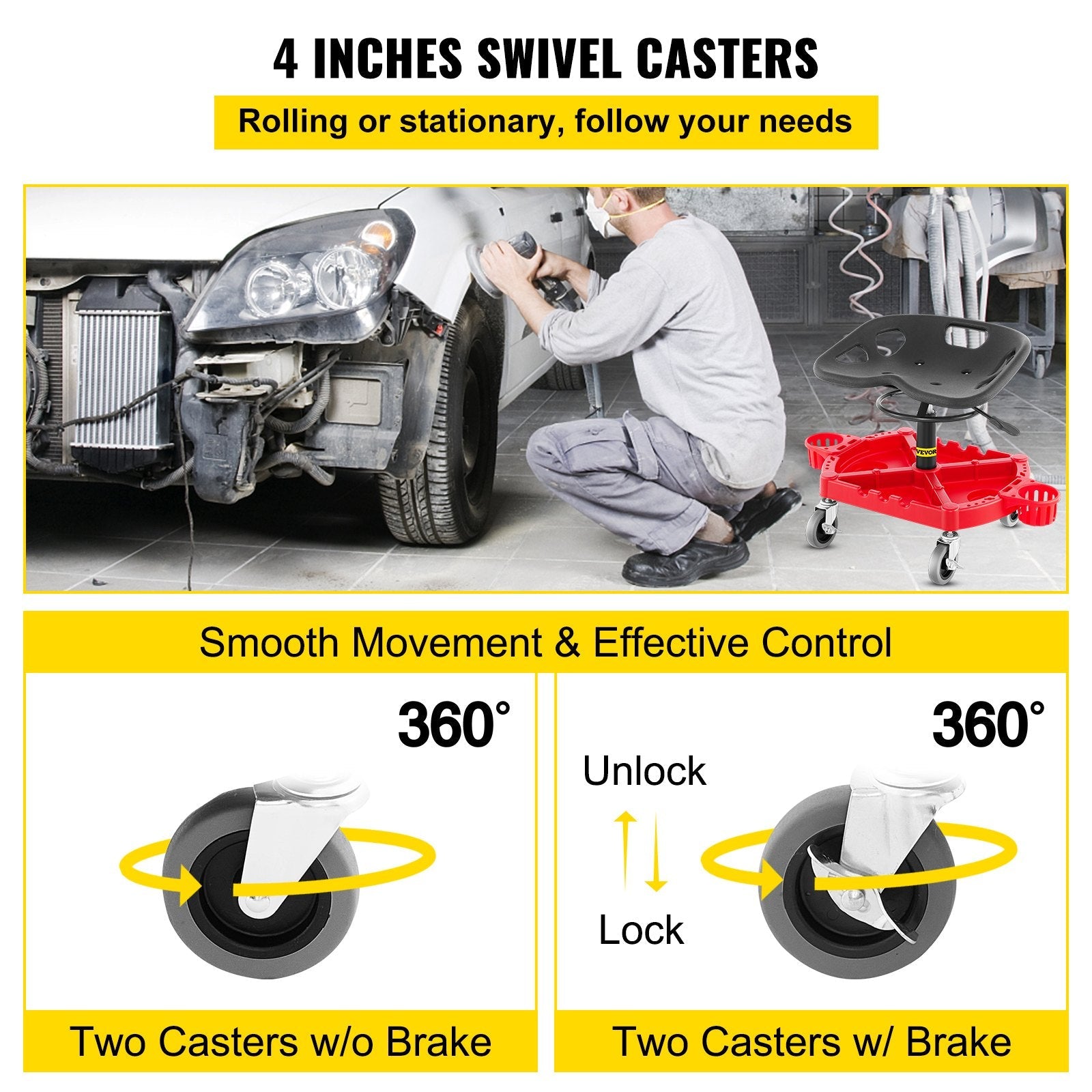 The VEVOR Rolling Garage Stool is a sturdy and comfortable work stool designed for workshops, auto repair shops, and other demanding environments. It supports up to 300 lbs and features an adjustable seat height from 18 to 23 inches, allowing users to find the perfect working position. The 360-degree swivel caster wheels provide excellent mobility, while the large plastic tool tray with two removable bottle holders keeps your tools and drinks within easy reach. Constructed with a durable steel frame and a comfy hollow seat made from high-density polyethylene, this red rolling stool combines practicality with comfort.