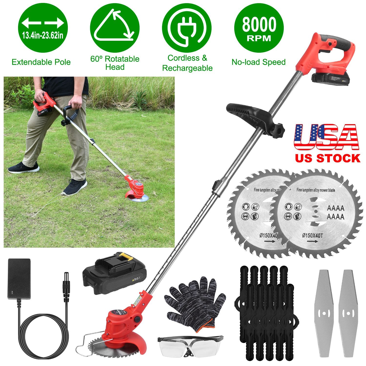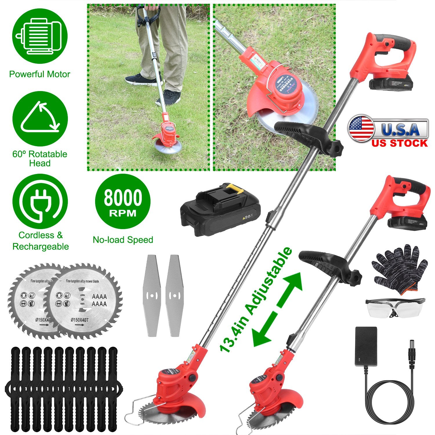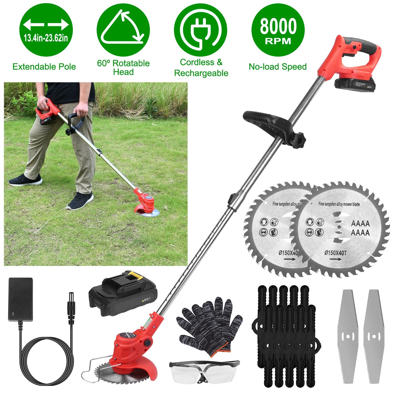 Multiple Blades: Includes 2 alloy saw blades for crop and bush cutting, 2 alloy blades for thick grass pruning, and 10 plastic blades for standard lawn mowing. Adapt the blades based on your trimming needs.
