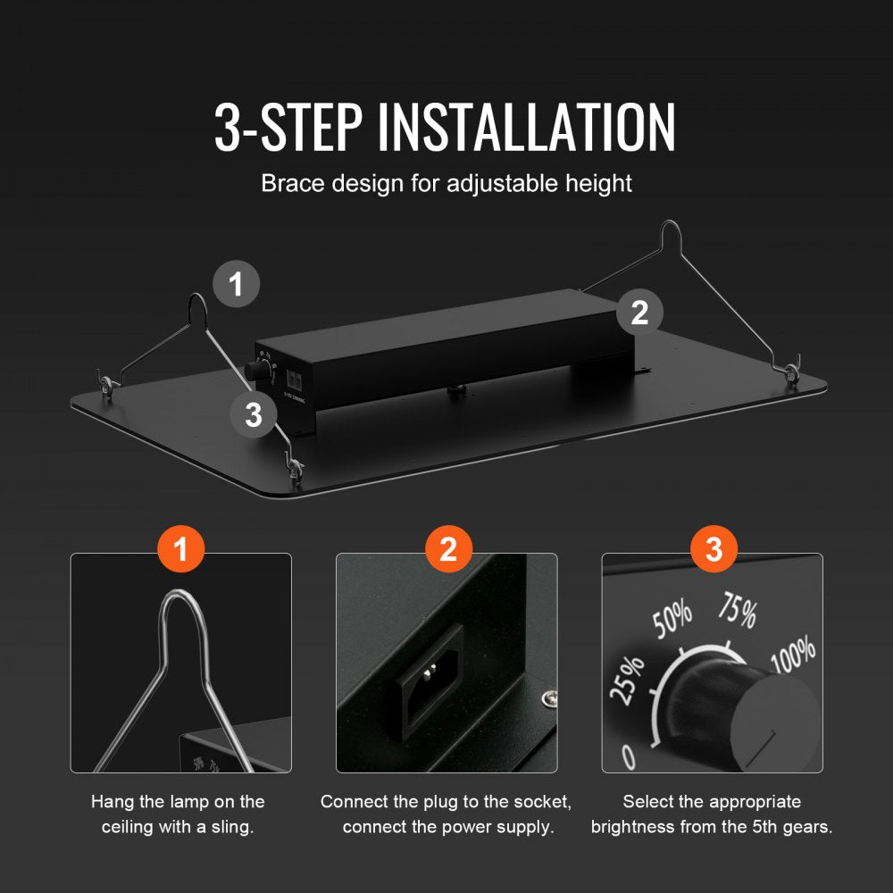 The VEVOR 300W LED Grow Light offers a full spectrum of sunlight-like irradiation, making it ideal for all stages of plant growth—from germination and seedling to veg and bloom. Powered by high-yield Samsung 2B1B diodes, this grow light delivers exceptional light intensity and coverage, promoting healthy plant growth and maximizing yields. It features a 5-level dimming control system with adjustable brightness to cater to your plants' specific needs. Additionally, the lamp is designed with an efficient heat dissipation system to keep temperatures optimal, while its dustproof design extends its lifespan. With the ability to daisy chain up to 30 units, this light is perfect for large-scale greenhouse setups.