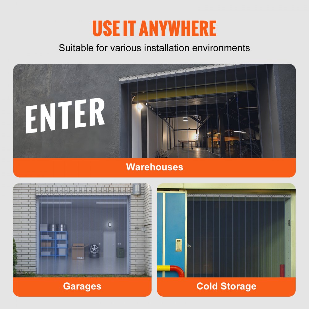 The VEVOR Strip Curtain provides clear visibility and reliable temperature control for walk-in freezers, coolers, warehouses, and industrial doors. Featuring 16 clear PVC strips, each measuring 7.9" wide and 96" high with a 50% overlap, this durable curtain effectively seals your space to reduce energy loss while allowing easy passage. Made from 0.08" thick PVC+DOTP material, it withstands temperatures from -4°F to 140°F. Quick to install and simple to roll or fold for storage, this curtain is a practical solution for maintaining climate separation without sacrificing accessibility.
