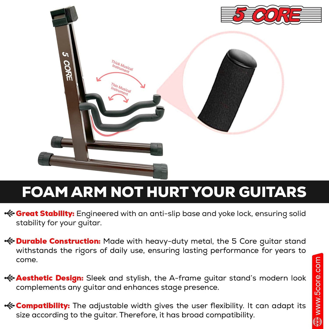 The unique shape of the arms holds large or small guitars safely. It increases the instrument compatibility significantly.
