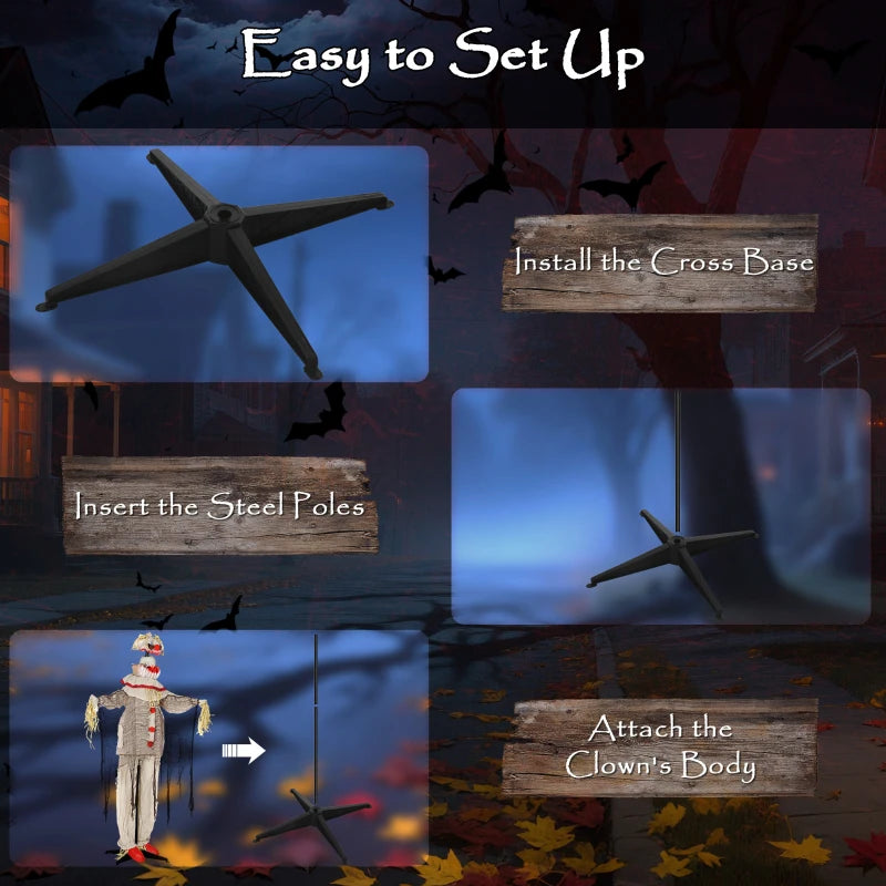 Terrify and entertain your guests with the Outsunny 68-inch Life-Size Animated Pumpkin Clown. This spooky party prop features a creepy pumpkin head, glowing LED eyes, and animated movement for a truly haunting effect. Battery-operated for easy placement anywhere indoors, it’s the perfect addition to Halloween parties, haunted houses, or themed events. Lightweight yet durable, this prop brings a chilling presence to your holiday décor.